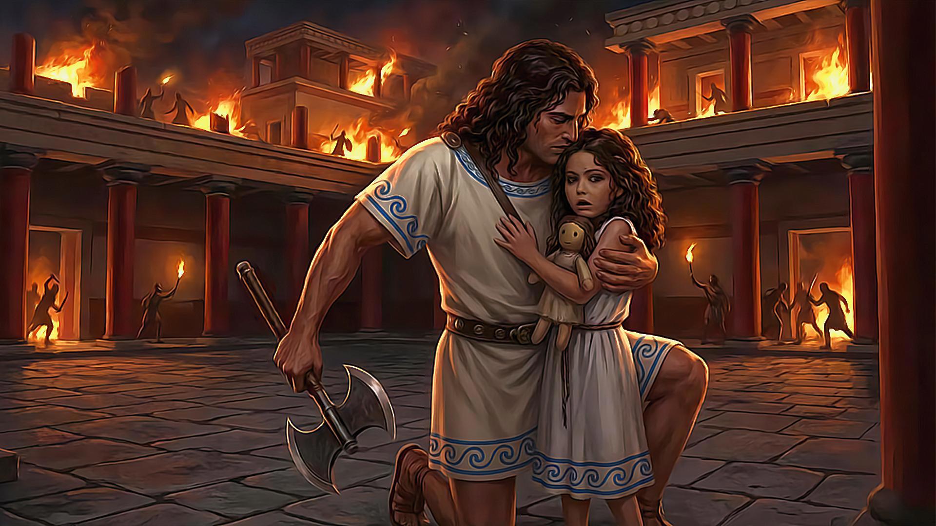 Девкалион бросается на помощь, взмахивает лабрисом. Падает, будто срубленный дуб…