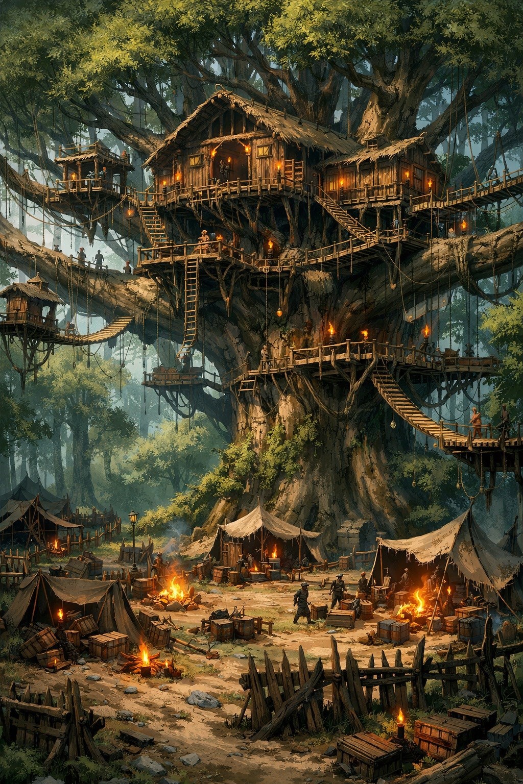 Бандитское логово Автор: Дари Псов Концепт-арт «Арены миров». фэнтези, дом на дереве, иллюстрация, локация, лагерь 14 Пожаловаться