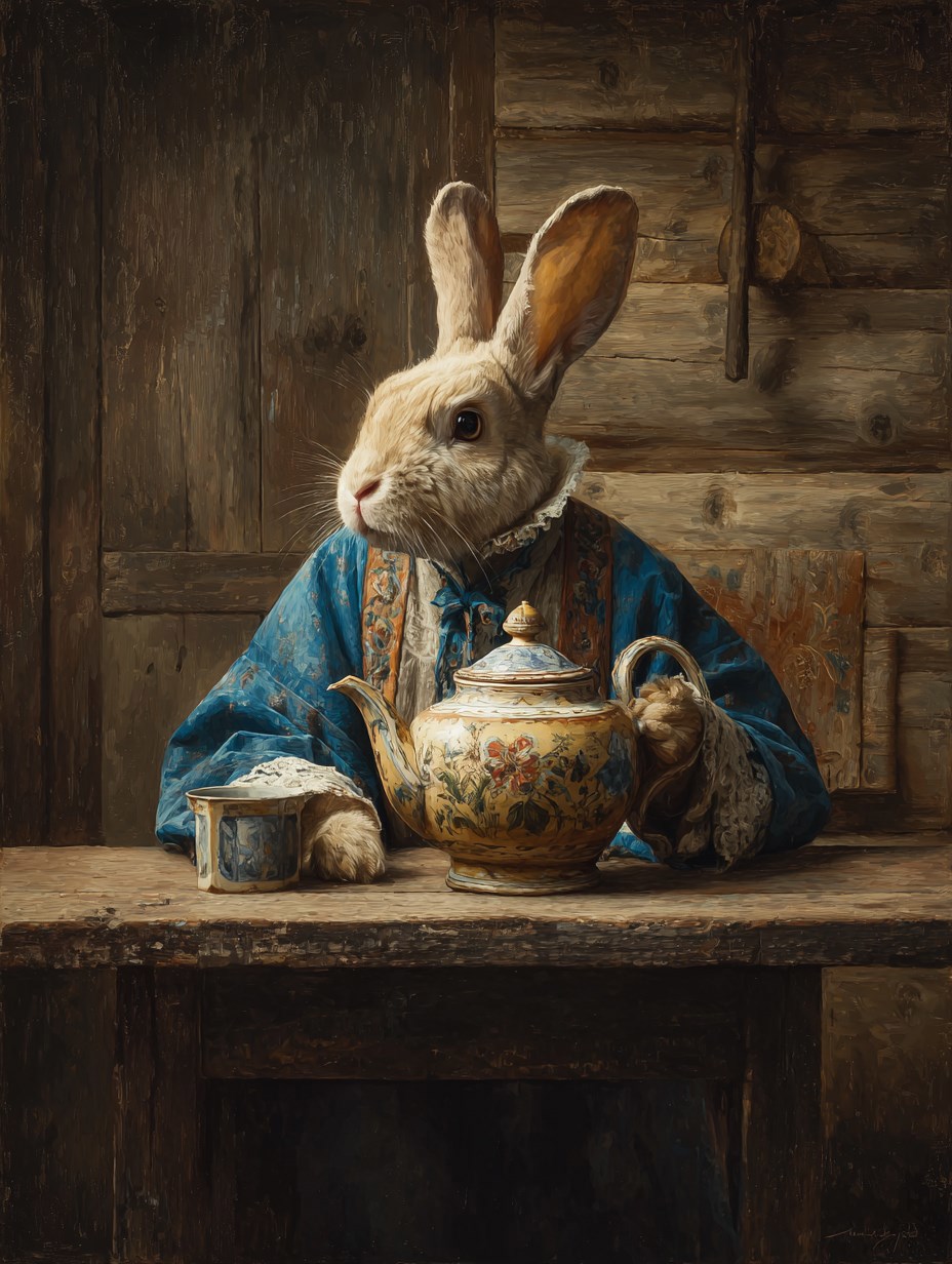 a hare in a blouse with a painted teapot in his hands, sitting at a wooden table. In the background is a room in a wooden village house --chaos 5 --ar 3:4 --stylize 150