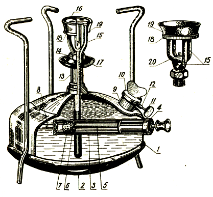 1 - резервуар; 2 - днище; 3 - трубка; 4 - крышка насоса; 5 - шток насоса; 6 - гайка насоса; 7 - кожаный манжет насоса; 8 - клапан насоса; 9 - корпус наливного люка; 10 - крышка наливного люка; 11 - воздушный винт; 12 - трубка воздушного винта; 13 - штуцер; 14 - гайка горелки; 15 - трубчатая часть горелки; 16 - испарительная камера; 17 - чашечка; 18 - упорное кольцо; 19 - отражатель; 20 - форсунка (капсюль, ниппель).
