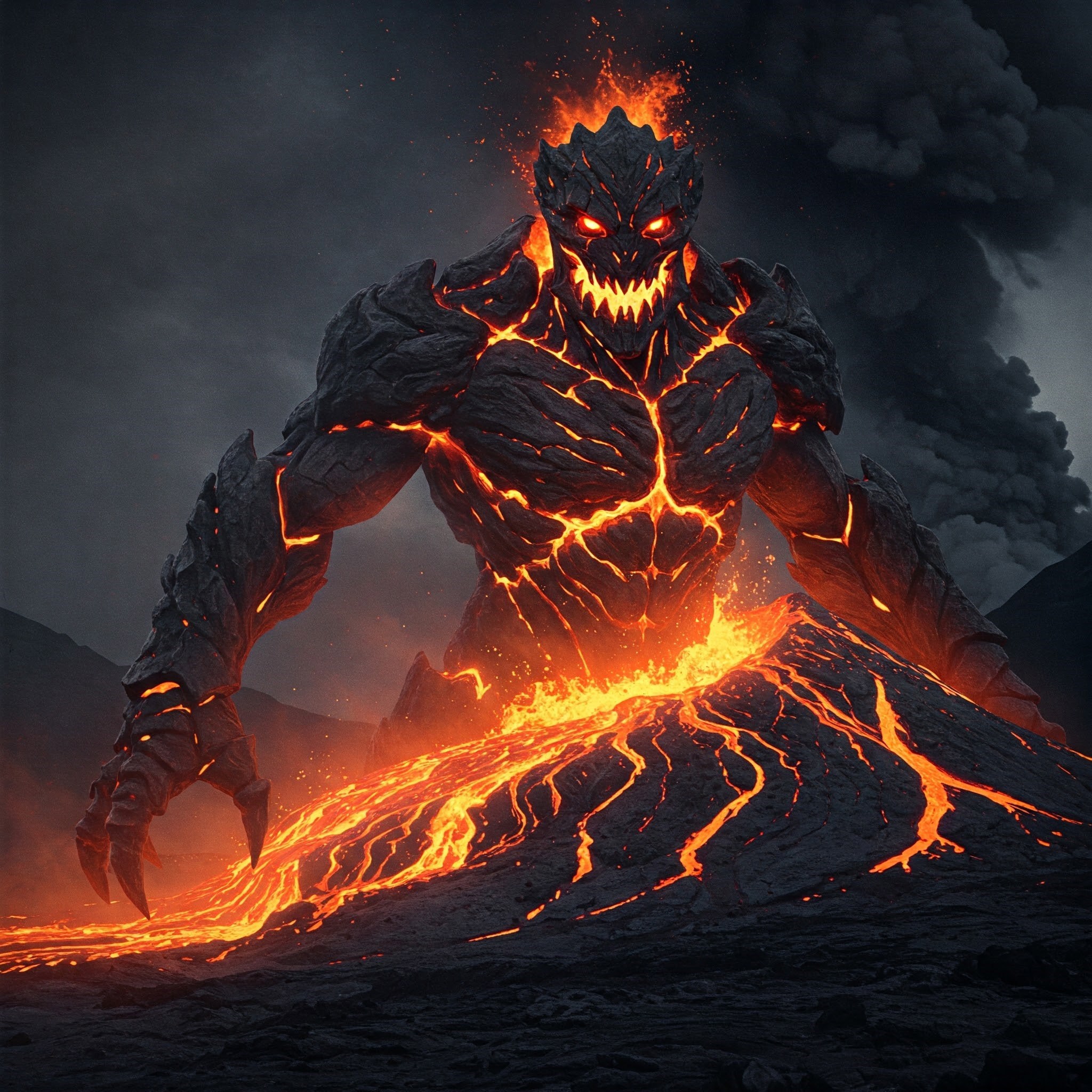 Иллюстрация к главе 15 книги "Савр 0->4". Лавовый гигант преследует главного героя и его сокланов.