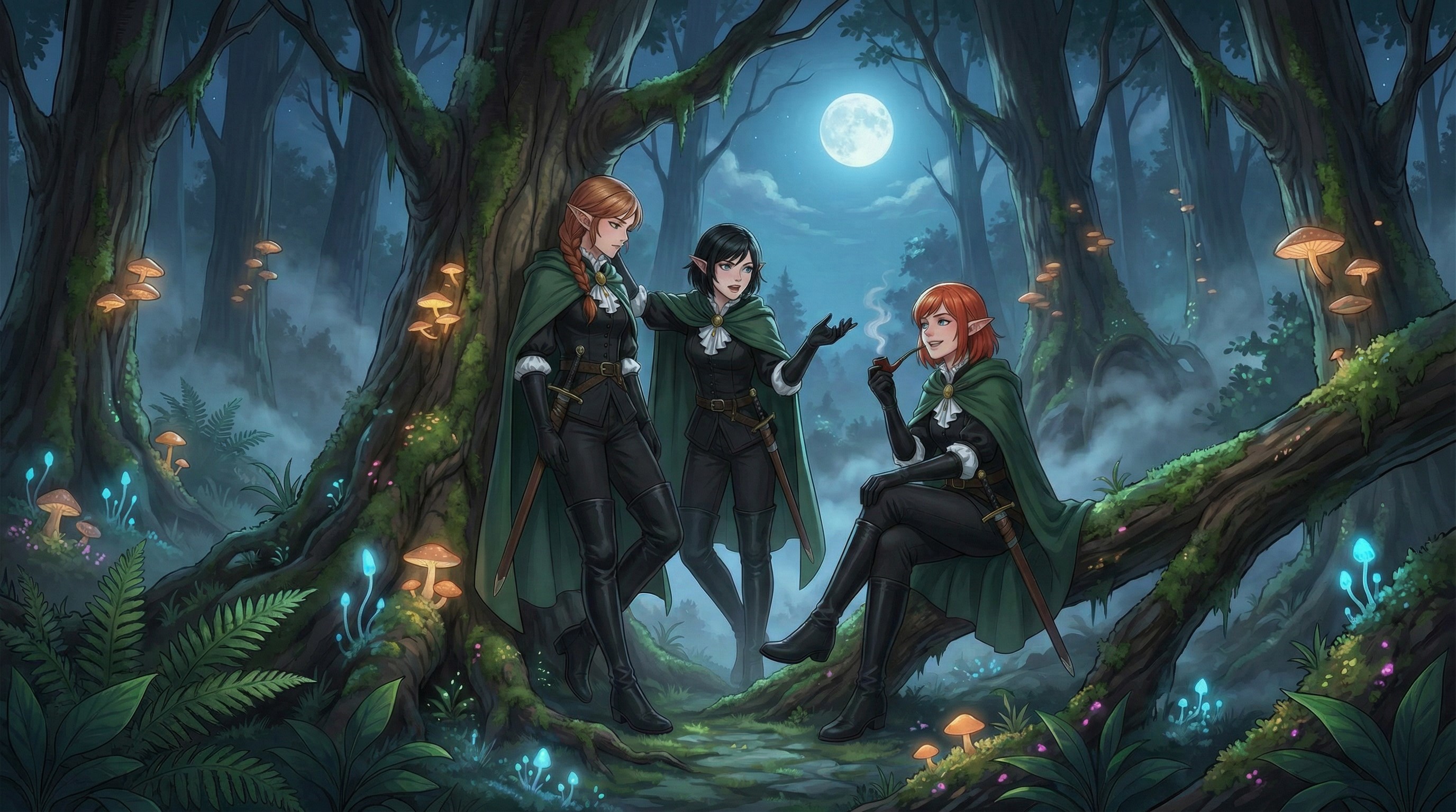 Три юных эльфийских воительницы коротают ночь у границ лесного княжества. Обои на рабочий от стол по мотивам Дертского цикла. Рисунок ИИ.