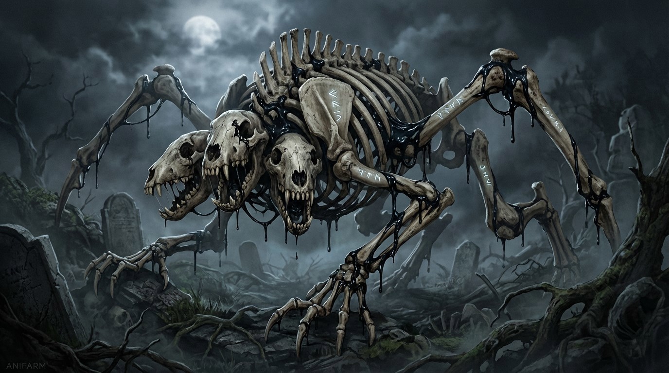Описание: Сплав костей разных существ, скрепленный чёрной слизью. Имеет три головы и шесть суставчатых конечностей.