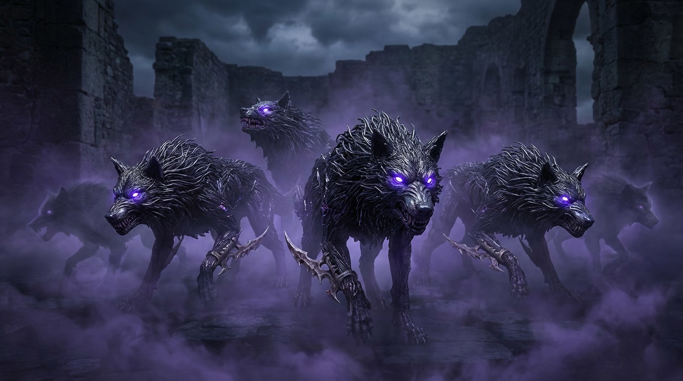 Из тумана начали выходить волки. Но это не были обычные звери. Их шерсть напоминала стальную проволоку, из глаз сочился фиолетовый свет, а вместо лап у некоторых были костяные лезвия.
