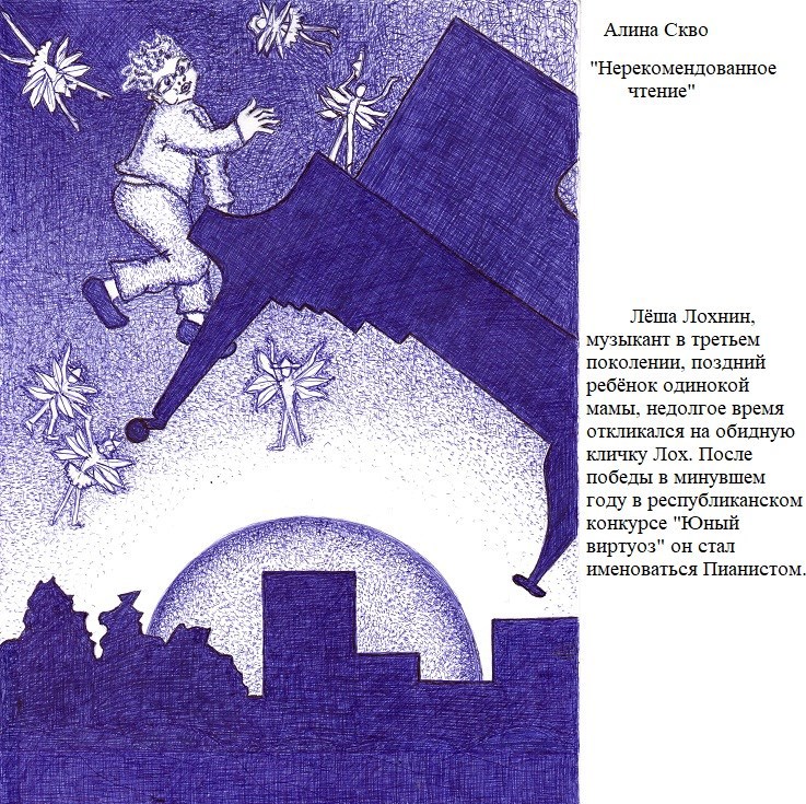Лёша Лохнин, музыкант в третьем поколении, поздний ребёнок одинокой мамы, недолгое время откликался на обидную кличку Лох. После победы в минувшем году в республиканском конкурсе "Юный виртуоз" он стал именоваться Пианистом. Лешкин портрет красовался на школьной доске в самом верху, как бы предводительствуя над всеми. Это не клеилось с неуверенным в себе подростком. Но фотограф не догадывался о застенчивости музыкального мальчика, поэтому выхватил из обоймы снимков именно тот, где новоявленный маэстро представал в самом смелом ракурсе вдохновения с вихрами, торчащими над щекастым лицом, с безумным взором триумфатора под потными очками, с растопыренными пухлыми пальцами, жестоко утопленными в клавиатуре. Книга здесь https://author.today/work/273270