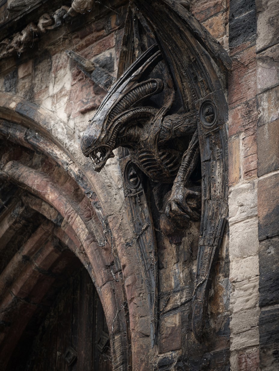 A gargoyle in the shape of an Alien (an alien monster) above the entrance arch of a Scottish church. 12th century. Art by Giger --ar 3:4 --profile j4k17bx --stylize 150