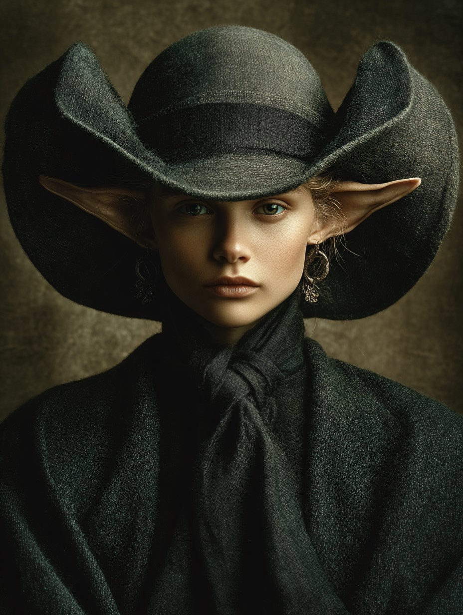a lady writer hiding her long elven ears under a lady's hat. The photography is in the style of Annie Leibovitz --ar 3:4 --stylize 150