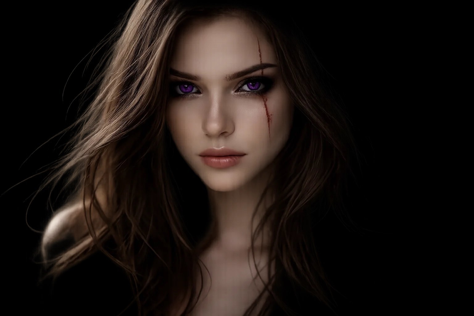 Её красота раздражала своей нечеловечностью. Волосы — не просто каштановые, а словно пропитанные сумраком осеннего леса — рассыпались живыми волнами. Лицо, слишком совершенное для смертной: широко поставленные глаза миндалевидного разреза, будто две трещины в реальности, за которыми мерцали фиалковые бездны. Ресницы, густые как крылья ночных бабочек, отбрасывали тени на скулы — острые, словно осколки разбитого зеркала. А шрам... Алая вертикаль, пересекающая лицо, не уродуя его, а придавая роковую завершённость — будто подпись Судьбы на шедевре.