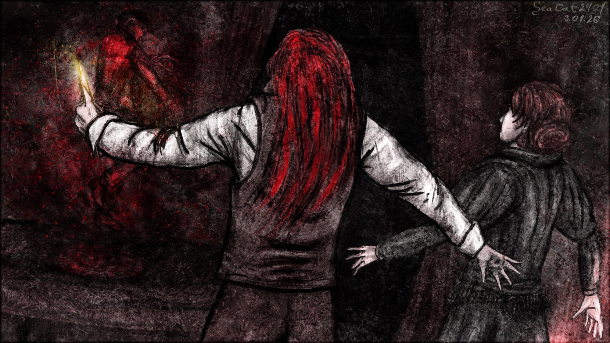 Иллюстрация к истории "Заслуженное клеймо", подчасти цикла "Наследники огненных путей". Не самая удачная, но я всё равно решила довести её хоть до какого-то результата. Призыв погибшего мужа Элеоноры Грин, который закончился именно так, как предсказывал Вестник Майло, но совершенно не так, как предполагали все остальные.