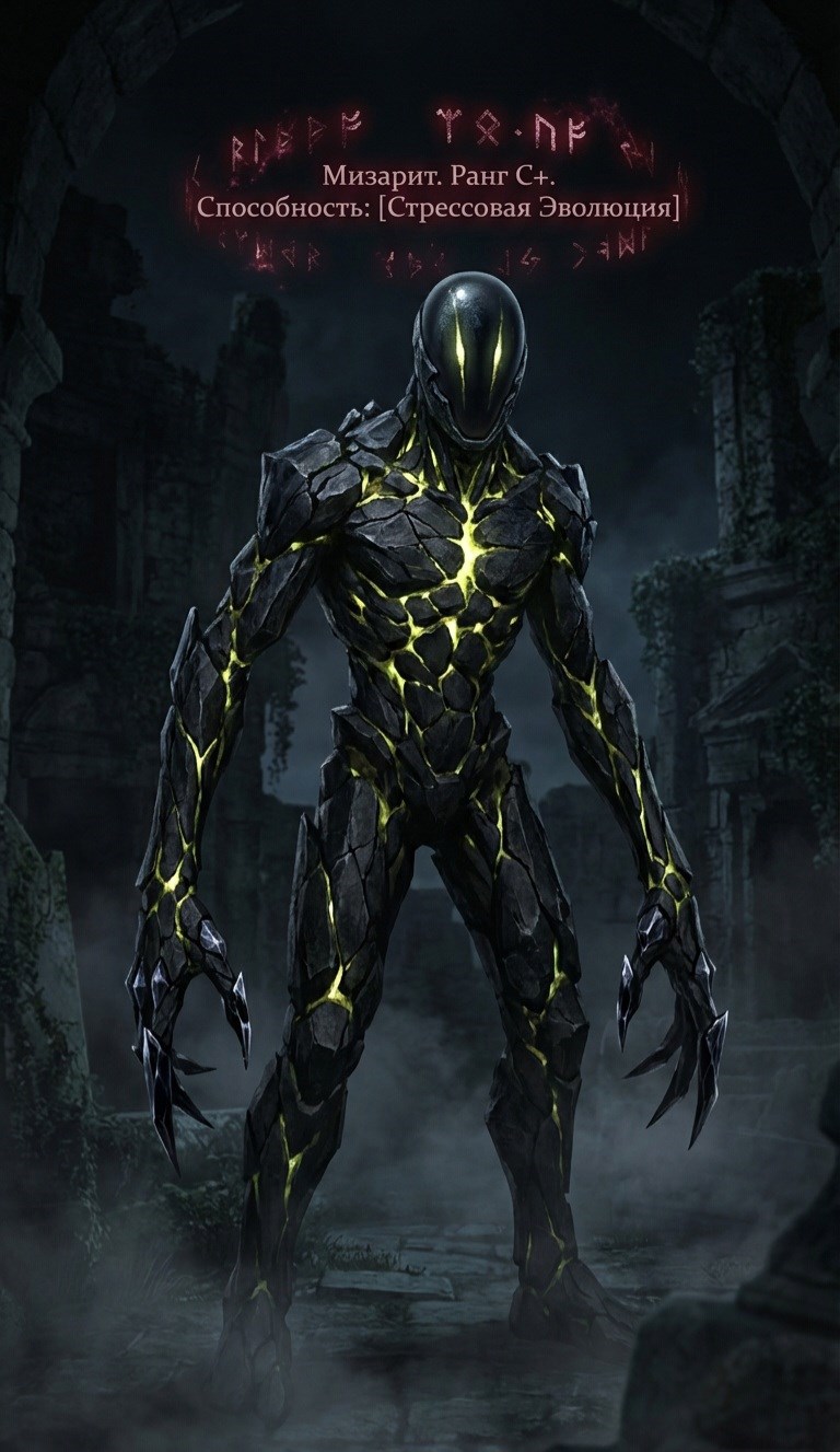 «Мизарит. Ранг C+. Способность: [Стрессовая Эволюция] — при получении критического урона или в условиях высокой опасности может временно эволюционировать до ранга B.»