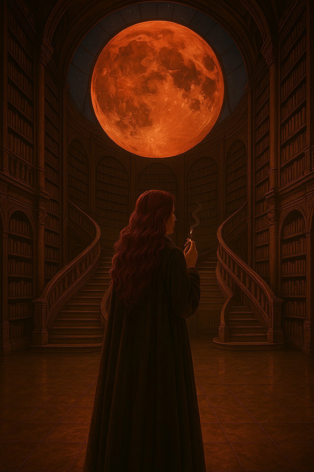 "Зелёные глаза распахнулись шире — в них отражался купол, под которым медленно текла кровавая луна, отбрасывая алый, мистический свет на бесконечные ряды книжных шкафов".