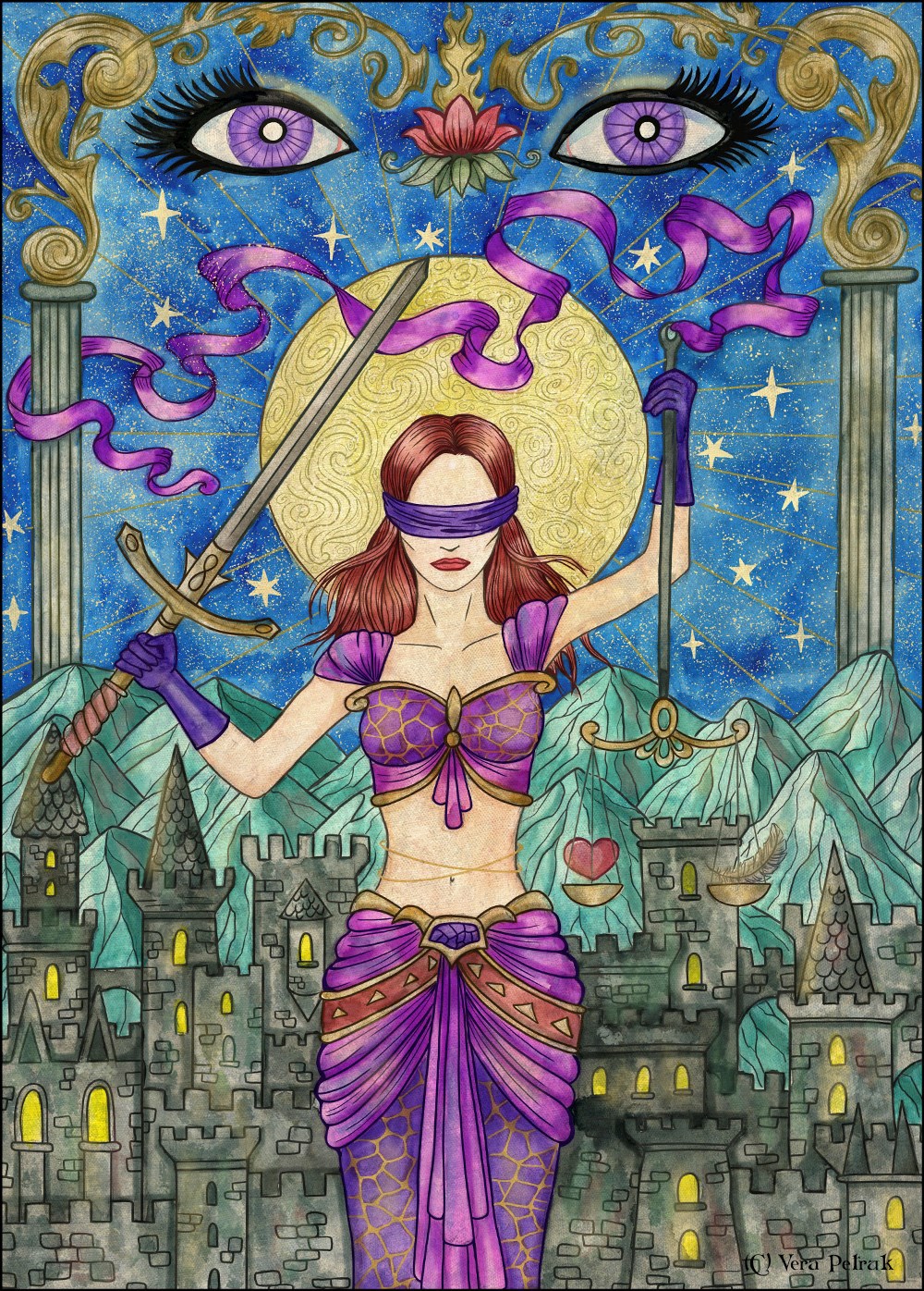 Иллюстрация для карты Таро "Справедливость". И да воздастся по делам нашим... Акварель, линеры, доработка в Фотошопе, старом и добром.