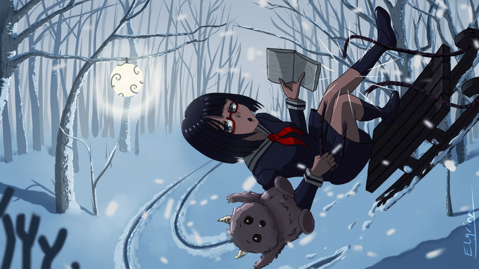 Существо, которое падает с санок вместе с девочкой - это популярный образ корейского импа. Такого можно встретить, к примеру, в манхве "Точка зрения всеведущего читателя".