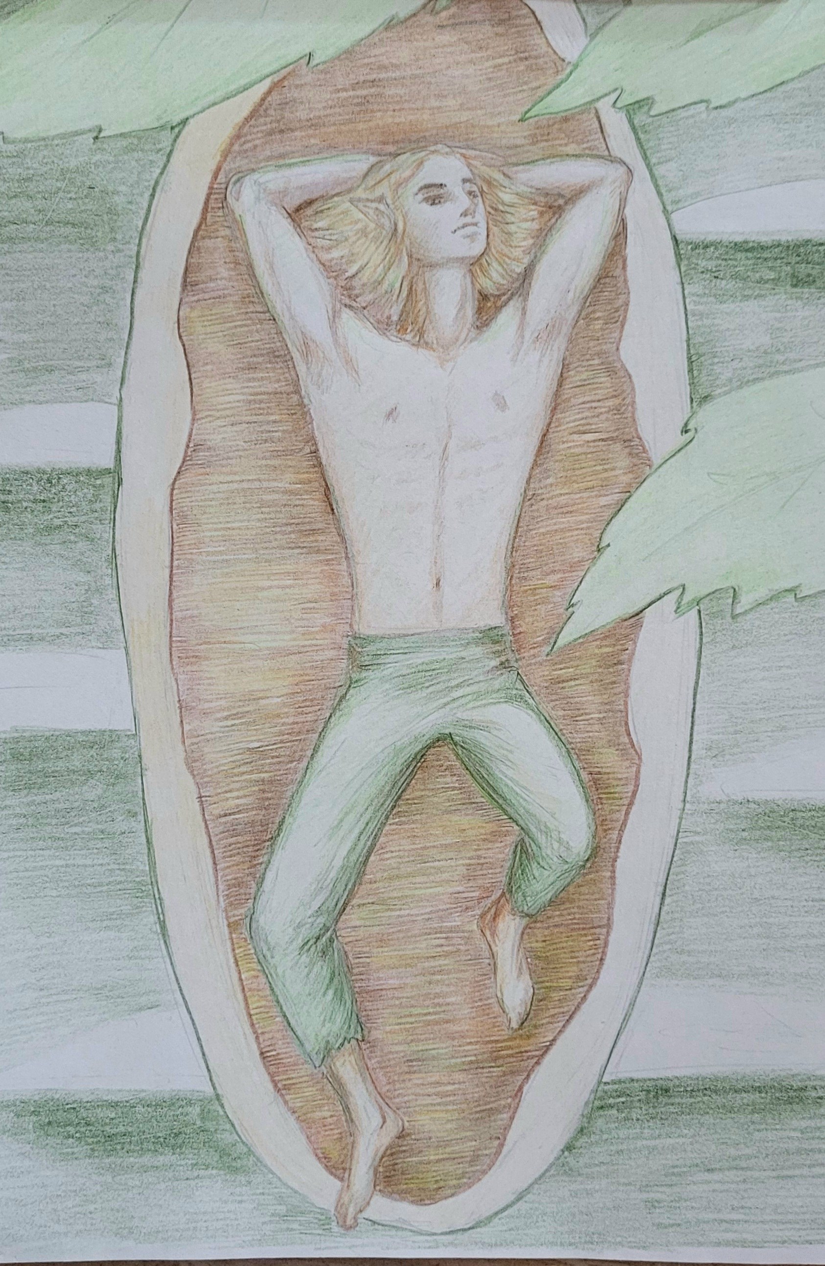 Пикси сделал лодку и качает его то ли маленький пруд, то ли большая лужа. И руку видно стукнул - локоть распух.