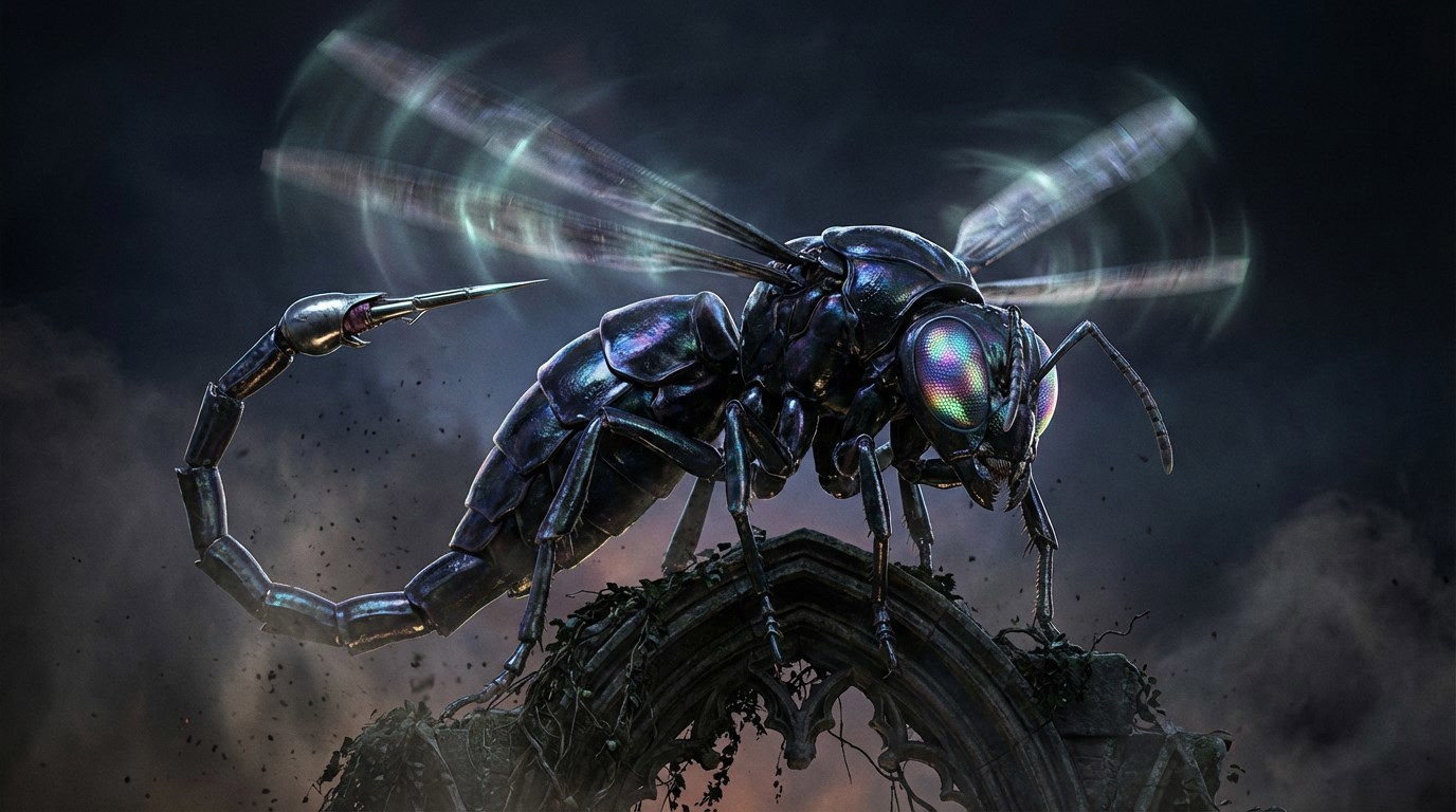 Существо размером с крупного орла, но лишённое перьев. Его тело покрыто чёрными, перламутрово переливающимися хитиновыми пластинами. Два пары тонких, как лезвия, крыльев, вибрирующих с невыносимым высокочастотным гулом. Длинный хвост с иглой-жалом. Выпуклые фасеточные глаза, видящие в полном спектре магии.