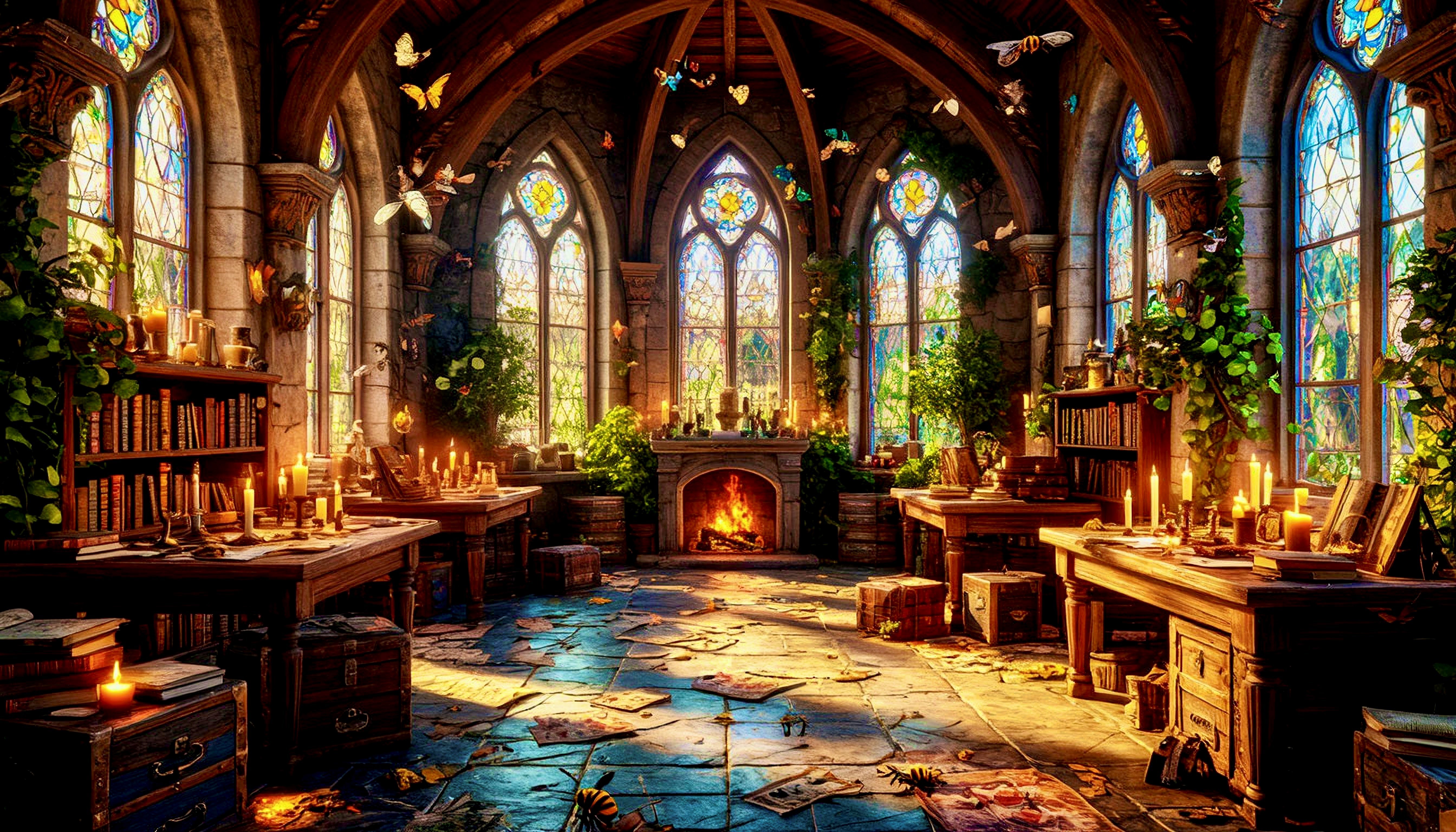 Комната напоминала небольшую оранжерею, полную света и всевозможных дивных растений, что оплетали стены. Поразительной красоты бабочки порхали над цветами, у улья суетились пчелы, а в дальнем уголке светлой залы даже притаился аккуратный камелек, в котором все еще горел огонь. У стен, заботливо укутанные листвой, покоились шкафы, наполненные еще большим количеством книг, чем те, что друзья уже видели, а небольшие столики и табуреты стояли тут и там с оплавленными свечами, что намертво приросли к деревянной поверхности и стали с ней единым целым. Везде лежали какие-то карты, некоторые из которых казались рисованными рукой, а некоторые походили на астрологические.