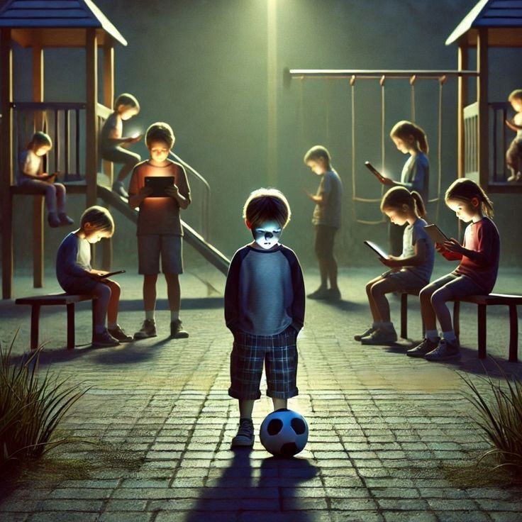 На иллюстрации изображены дети на детской площадке, которые игнорируют традиционные игры и общение, будучи полностью поглощены своими электронными устройствами, светящимися в темноте. Она выполнена в драматичном стиле, с сильным контрастным освещением, подчеркивающим свет от экранов гаджетов и создающим мрачную, уединенную атмосферу. В центре на переднем плане стоит пацан. В отличие от остальных, у него в руках нет устройства, а у его ног лежит футбольный мяч. Его взгляд опущен, он одинок в толпе, хотя вокруг него много детей. Но все они погружены в свои планшеты или телефоны, их лица и руки освещены только холодным светом экранов, создавая ощущение отчужденности.