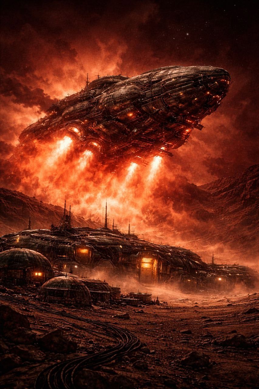 Громадная махина корабля, объятая плазмой торможения, медленно, словно нехотя, надвигалась на купол. Свет её двигателей, слепяще-багровый, поймал в отражении «Первозданный», и на секунду показалось, что горит не корабль, а их последнее убежище.