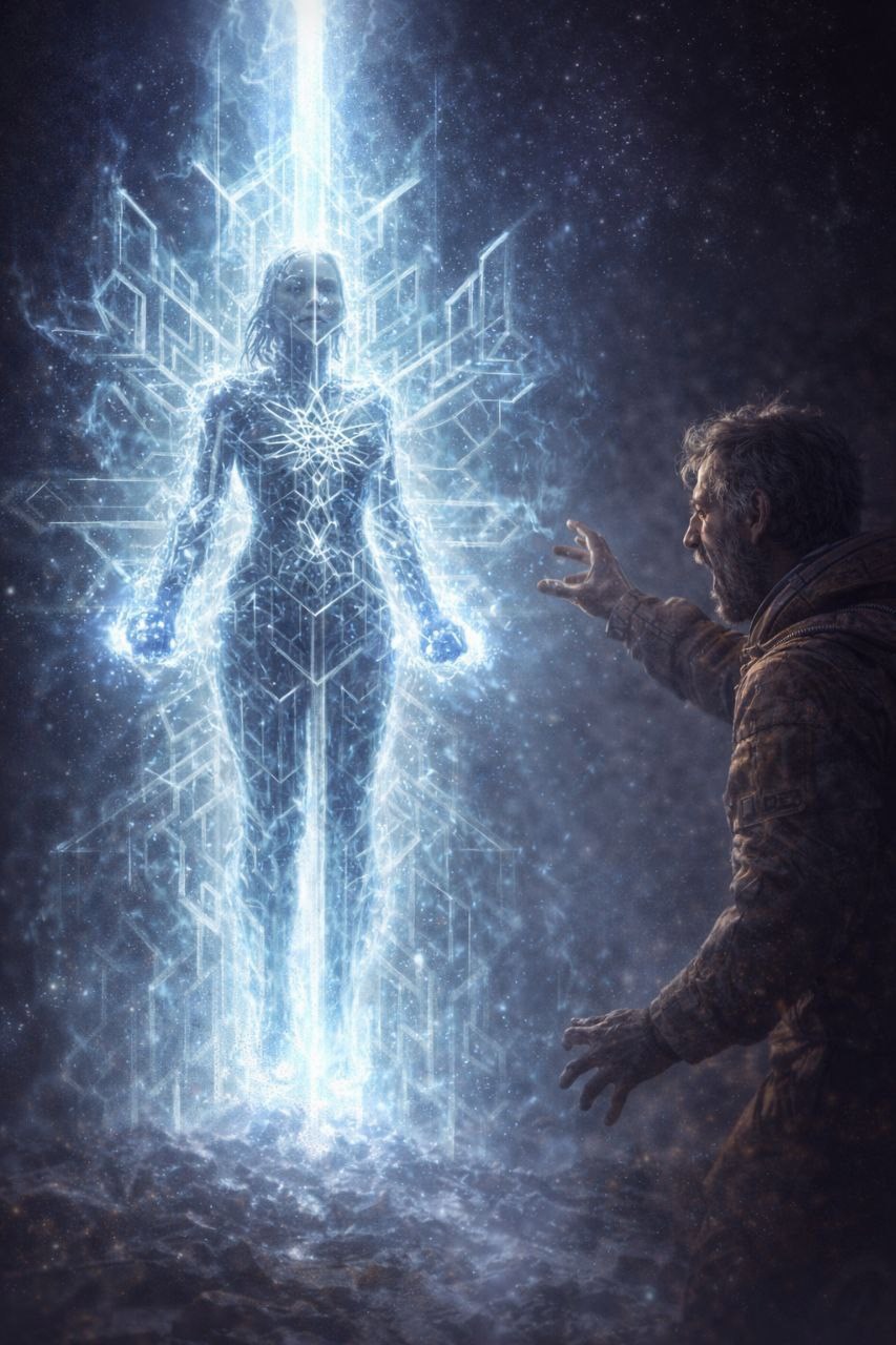 Столп сомкнулся вокруг неё. Её контуры расплылись, растворились в сияющей матрице. На секунду сквозь мерцание были видны её очертания — выпрямленные, неестественно жёсткие, как у статуи. Потом свет сгустился, и внутри начал расти кристалл. Не дерево, как на Земле, а идеальная, сложная геометрическая форма — что-то среднее между снежинкой и схемой процессора. Он нарастал,