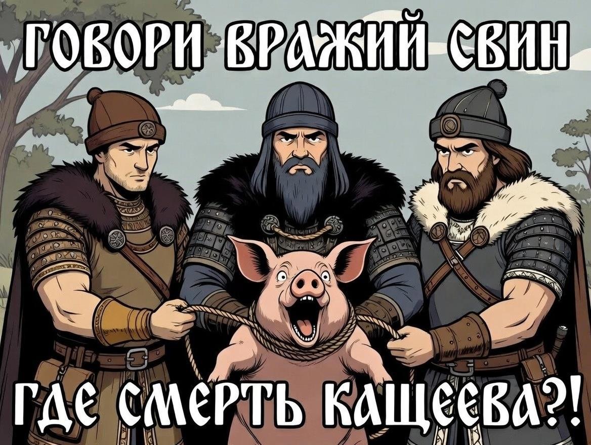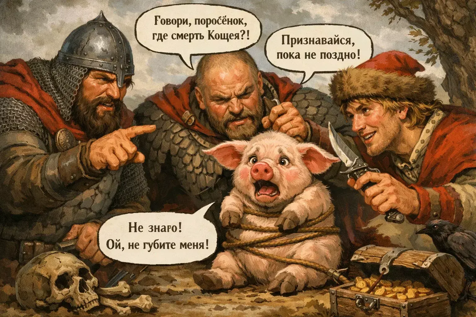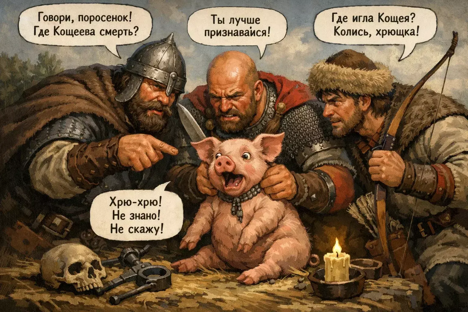 ТрИ БОГАТЫРЯ, Илья Муромец , Добрыня Никитичь, Алёша Попович, ПОЙМАЛИ ПОРОСЕНКА И ДОПРАШИВАЮТ ЕГО - ПЫТАЯСЬ ВЫЯСНИТЬ ГДЕ НАХОДИТСЯ КОЩЕЕВА СМЕРТЬ