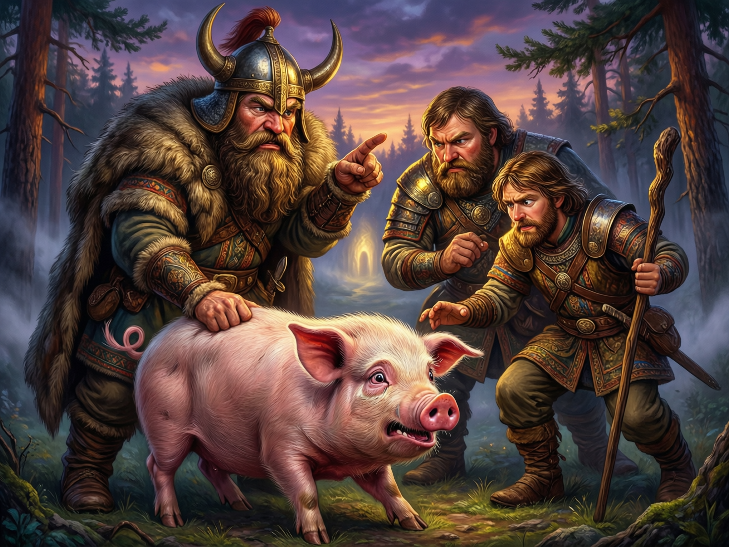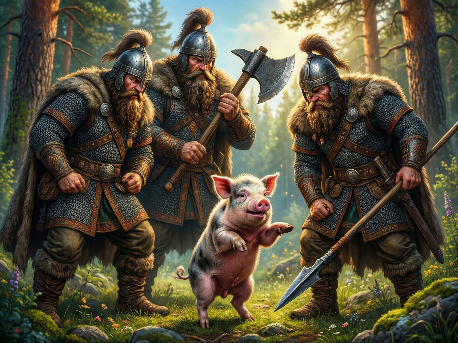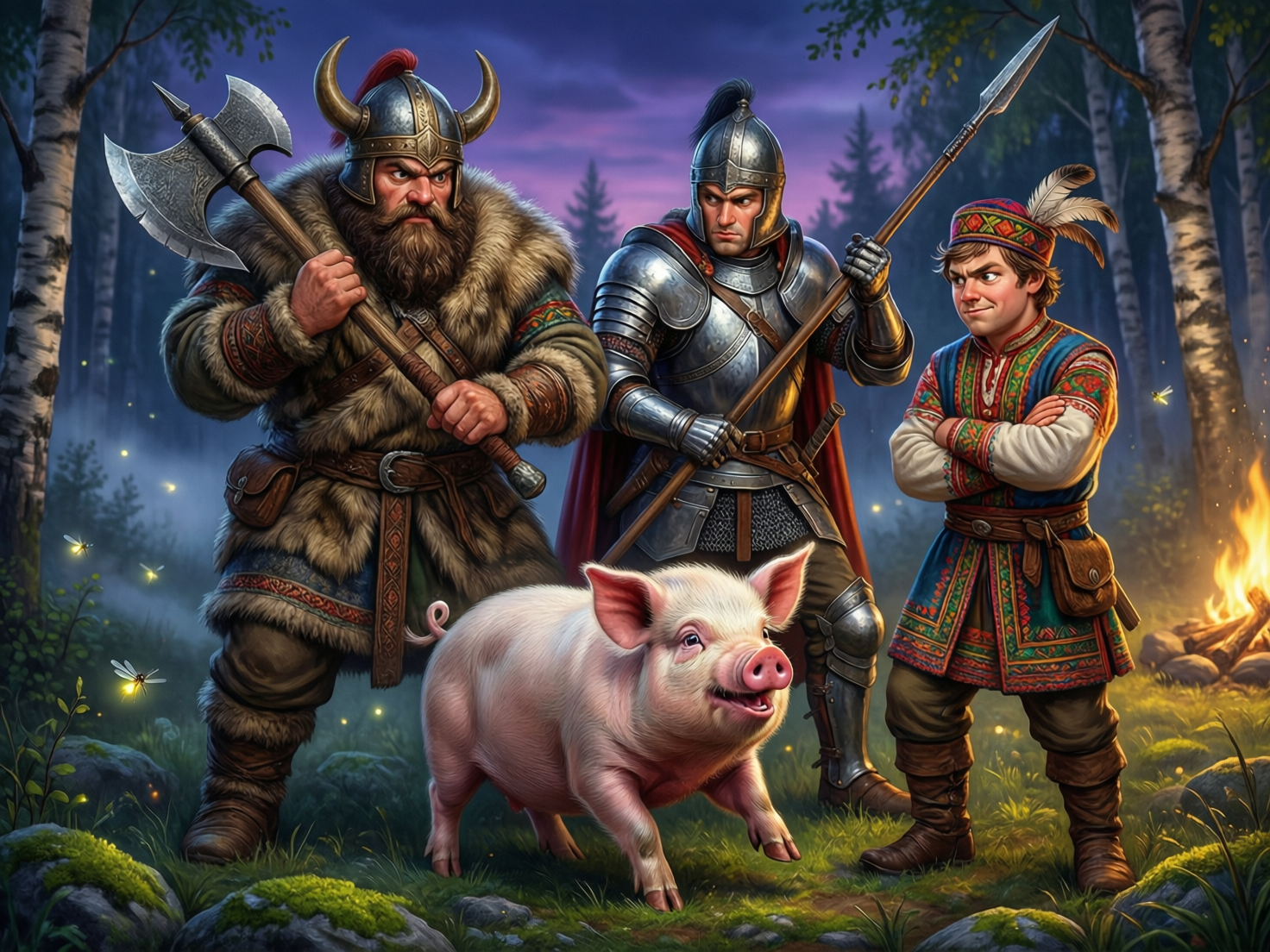 ТрИ БОГАТЫРЯ, Илья Муромец , Добрыня Никитичь, Алёша Попович, ПОЙМАЛИ ПОРОСЕНКА И ДОПРАШИВАЮТ ЕГО - ПЫТАЯСЬ ВЫЯСНИТЬ ГДЕ НАХОДИТСЯ КОЩЕЕВА СМЕРТЬ