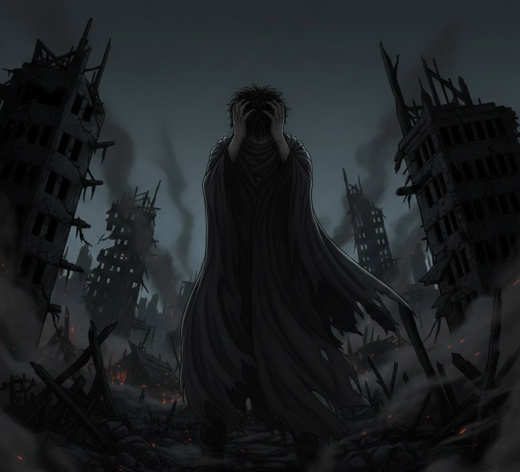 Загадочный мужчина в рваном плаще стоит среди разрушенного города, сжимая голову руками. Вокруг него — обломки зданий, дым, тлеющие пожары и густой серый туман, создающие ощущение отчаяния, утраты и полной разрухи.