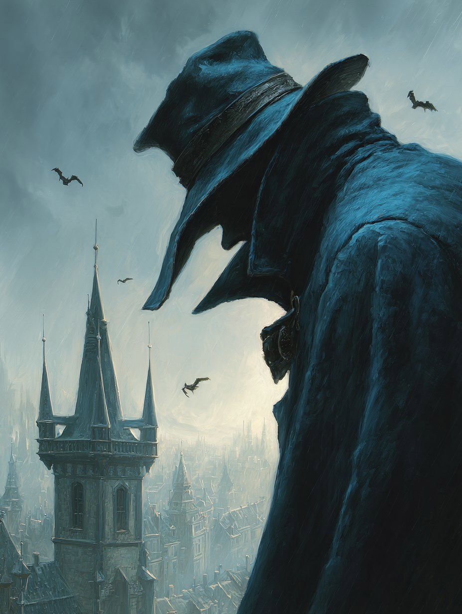 a cloaked detective, gothic city background, fantasy --chaos 5 --ar 3:4 --stylize 150