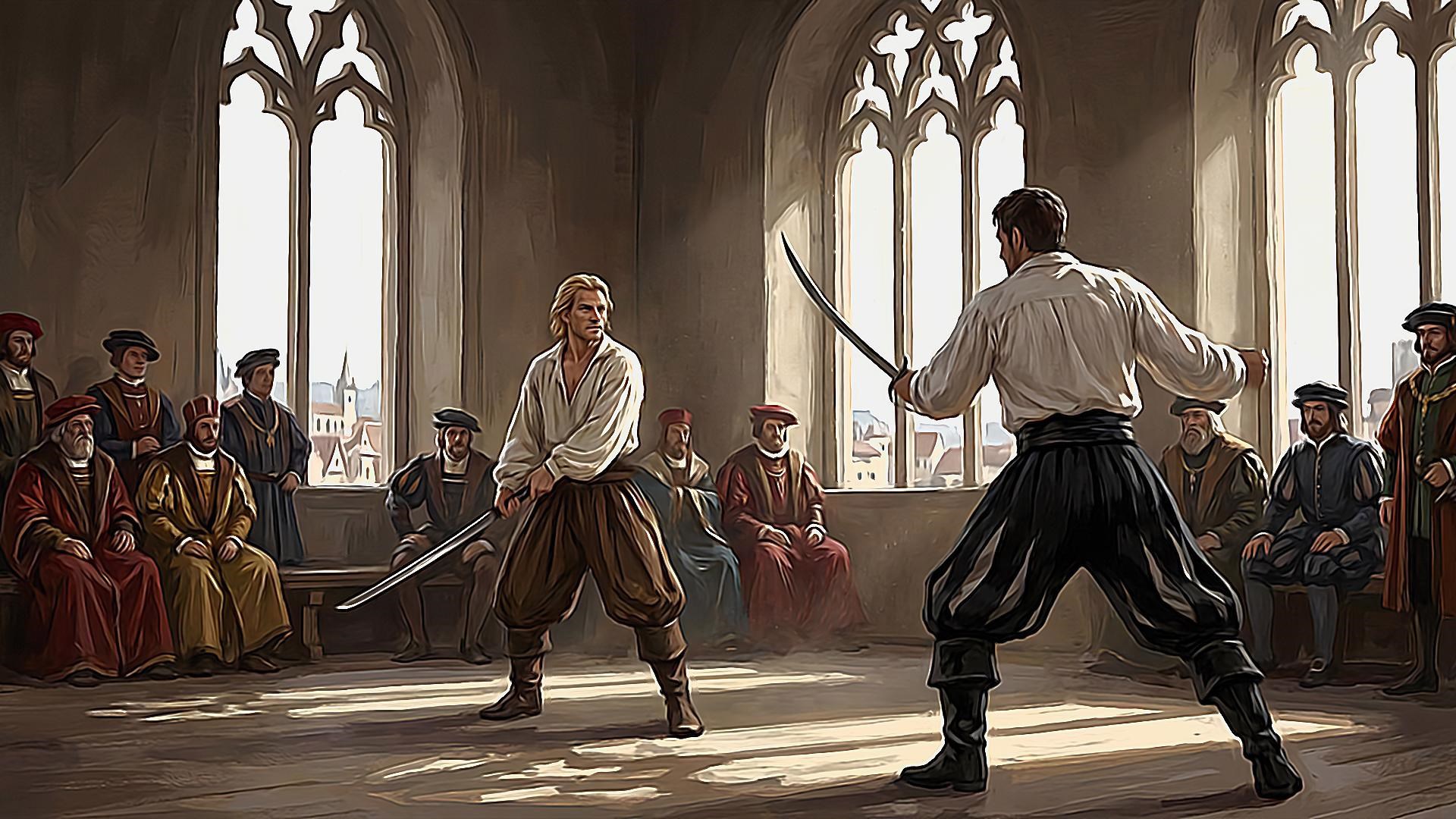 Раньян вынес оружную руку вперед и в сторону, сделал плавный шаг, одновременно чуть приседая и разворачиваясь на месте. Выглядело это как танцевальное движение, причем не веселья ради, а скорее как часть некоего ритуала. Элемент языческой пляски. Бретер вынес далеко вперед левую, опорную ногу, что покойный Чертежник назвал бы ошибкой. Порфирус наоборот, «подобрал» ноги «под себя», внимательно приглядываясь к противнику. Опустил клинок ниже, взяв рукоять предельно широким хватом, у самых концов, чтобы увеличить рычаг.