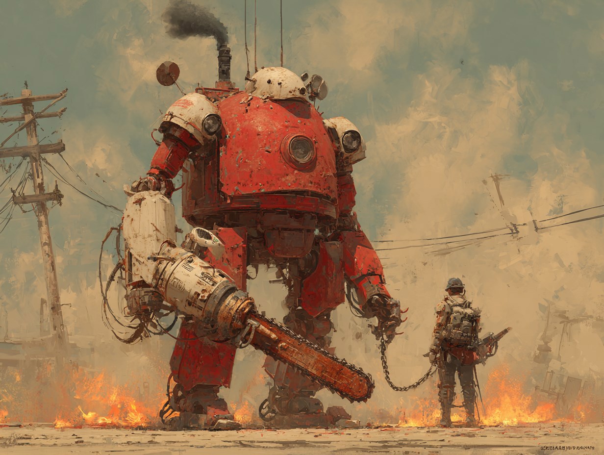 mechanical armor with a chainsaw, manapunk. Art by Jakub Rozalski