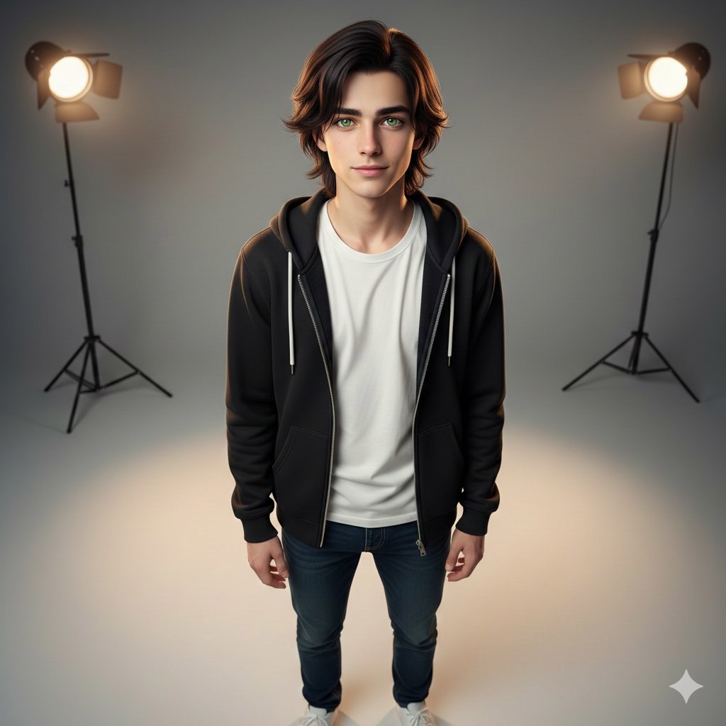 Первым в объективе появился он. Артём. Он стоял у гримёрной, лениво перелистывая сценарий. Тёмная чёлка падала на ярко-зелёные глаза, а на лице читалось абсолютное спокойствие, граничащее с высокомерием. В жизни он выглядел ещё эффектнее, чем на фото: квадратная челюсть, резкие скулы и эта чёрная кофта поверх белой футболки, которая сидела на нём идеально.