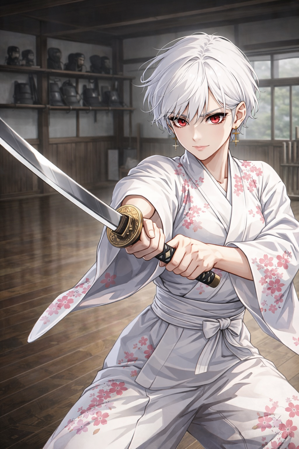 Когда она надевает белое кимоно с розовыми цветами, возникает сильный контраст: