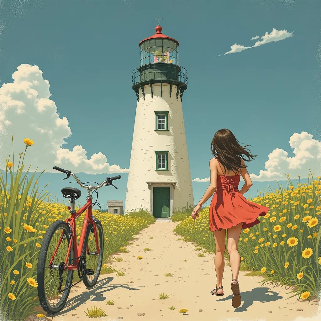 Шикарная брюнетка, в коротком сарафане двигалась в сторону дома. Издалека маяк казался двумерным исполином, словно нарисованным на плоскости, где забыли наштриховать объём. Очень необычное зрелище. Плоский велосипед стоял у двери.