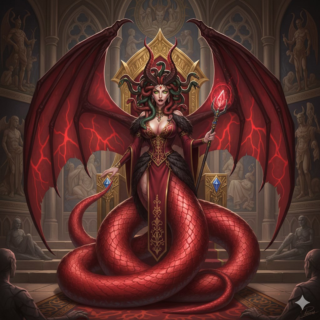 Внешность, - огромный змеиный хвост красного цвета, вместо волос змеи имеет большие рога красного цвета, зелёные глаза являются элитой.