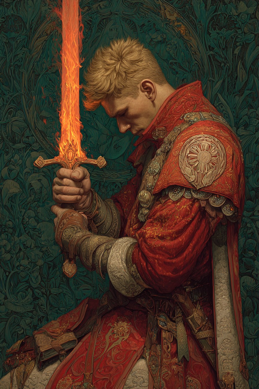 A twenty-year-old, short-haired, fair-haired warrior in a surcoat with a Celtic crest. He holds a two-handed sword with a flaming blade. Style: Viktor Vasnetsov --chaos 5 --ar 2:3 --stylize 150