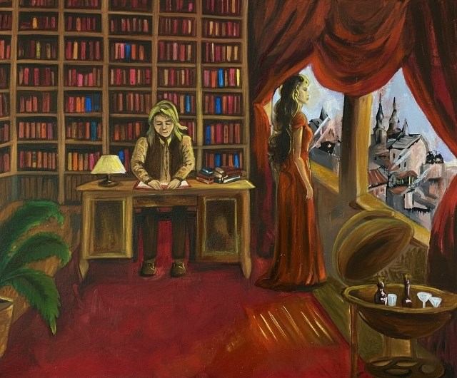 На своей новой работе мне хотелось изобразить себя, работающей в идеализированном кабинете в «Паровом городе» Эдс, являющейся центром всех моих романов. В компании с персонажем из одной моей книжной серии.