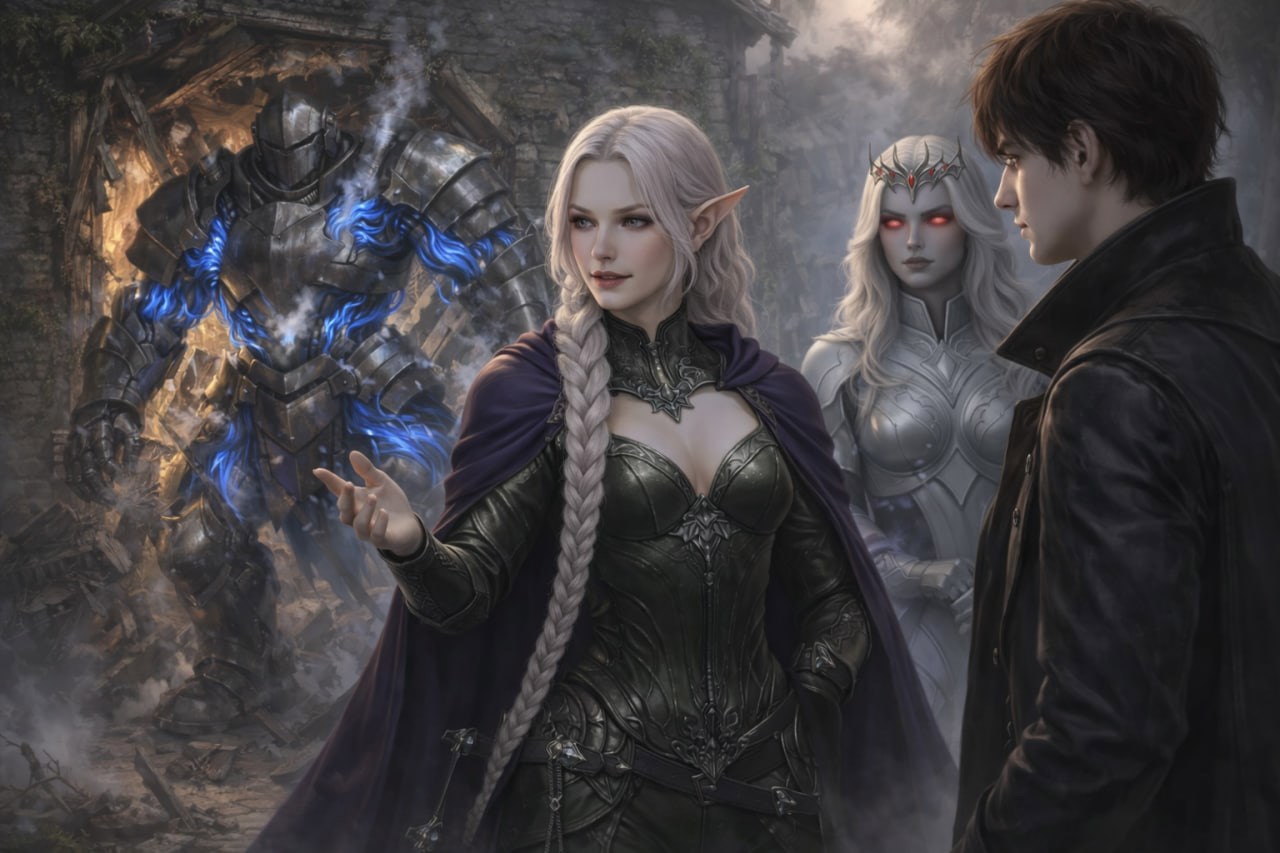 Айрин, мой прекрасный и самый первый персонаж, рассказывает о природе Края Ненависти новым посетителям - Казуме и Кире Найтшифт. Сзади разломали дверной проём живые доспехи