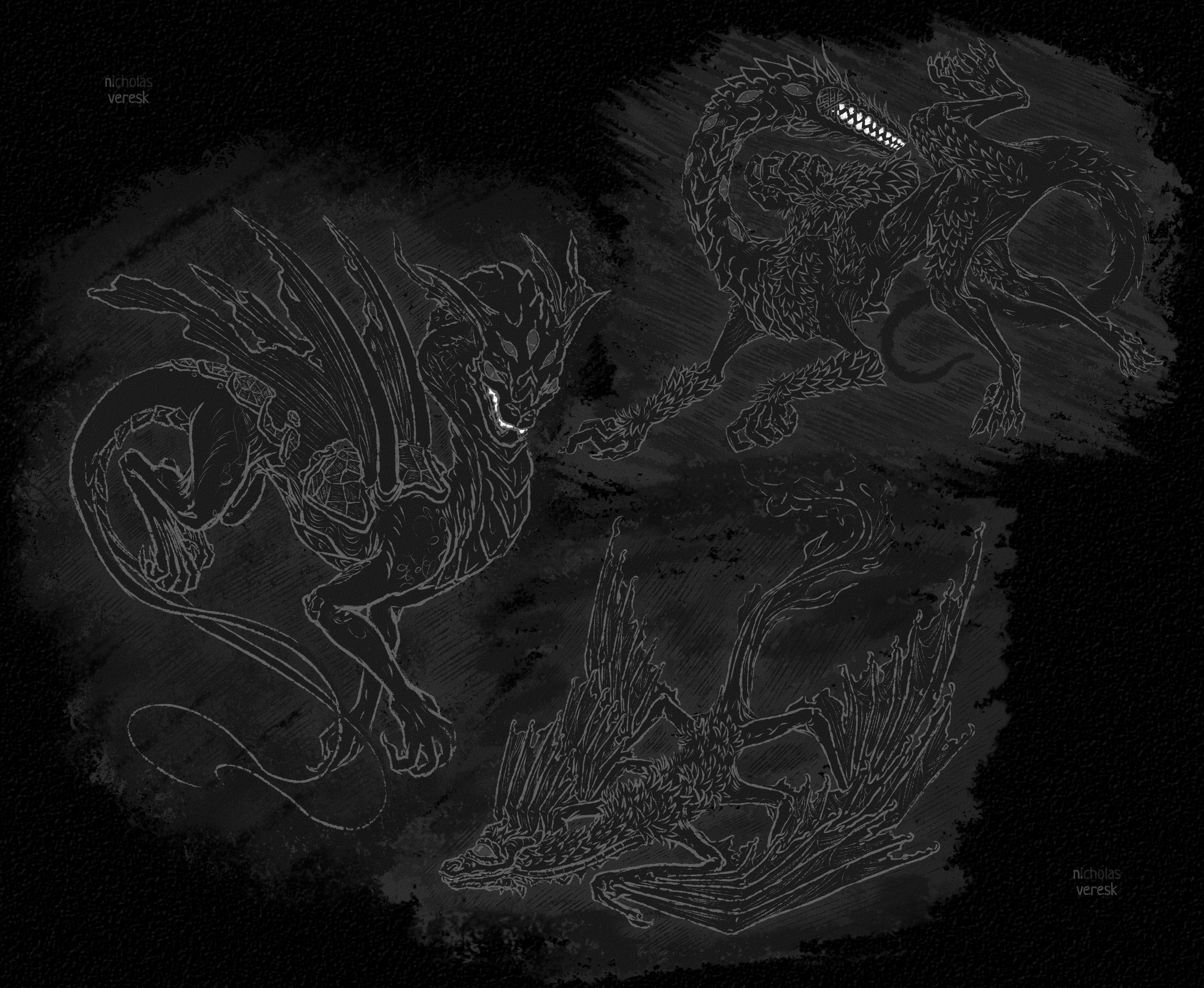 Имена этим трём: Йота, Дельта и Тета, где у первой много глаз, а у последней — крыльев. Иллюстраций три, находятся на разных страницах повести. Очень мало довелось поменять: побольше штриховки и живее сделать лапы Дельте. Старый вариант в виде анимации лежит тута: https://author.today/art/176399