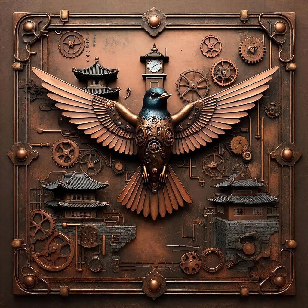 Изображение представляет собой панно в стиле стимпанк, на котором изображена механическая птица в окружении шестерёнок и элементов архитектуры. Это произведение искусства объединяет в себе индустриальную эстетику и ретрофутуристический шарм в стиле стимпанка (steampunkа), для которого характерно сочетание металла, шестерёнок, винтов и медных элементов. Птица выполнена с использованием металлических перьев и видимых механизмов. Фон украшен часами, пагодами и сложной системой труб и зубчатых.
