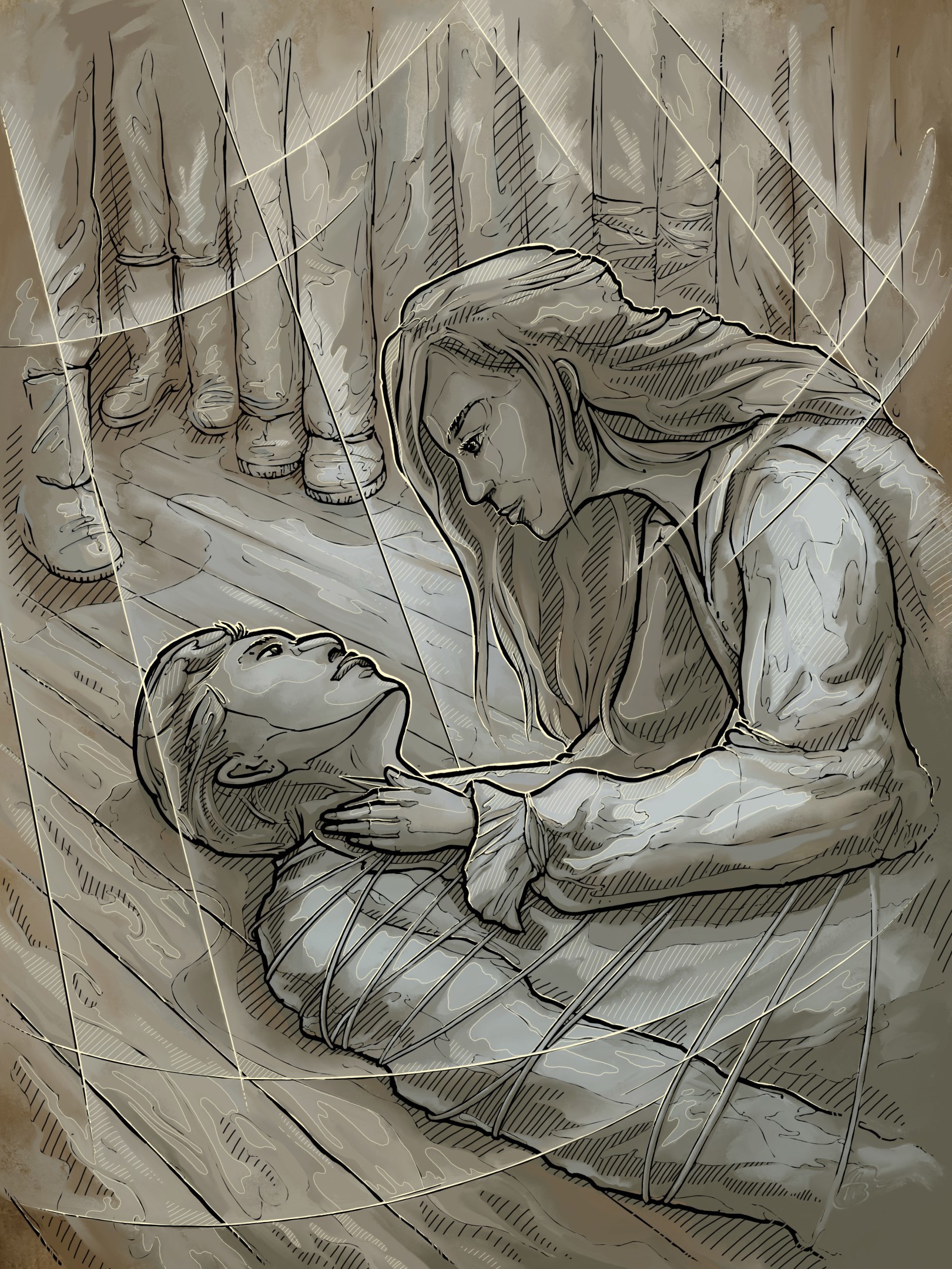 Опускаюсь на колени, так, чтобы он оказался подо мной, склоняюсь, чувствуя горячую волну, прокатившуюся по животу, и мягко провожу пальцами по лицу беспомощного Эхсана. На миг, всего миг, который я словила, его дыхание сбивается, а после подношу пальцы к его шее, в которых уже зажат нож.