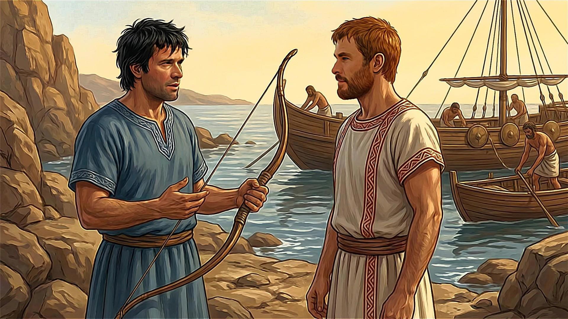 На заглавной иллюстрации Арат, сын Куршассы, царь Трои. За его спиной висит лук, который будет подарен Лаэрту и потом перейдёт Одиссею.