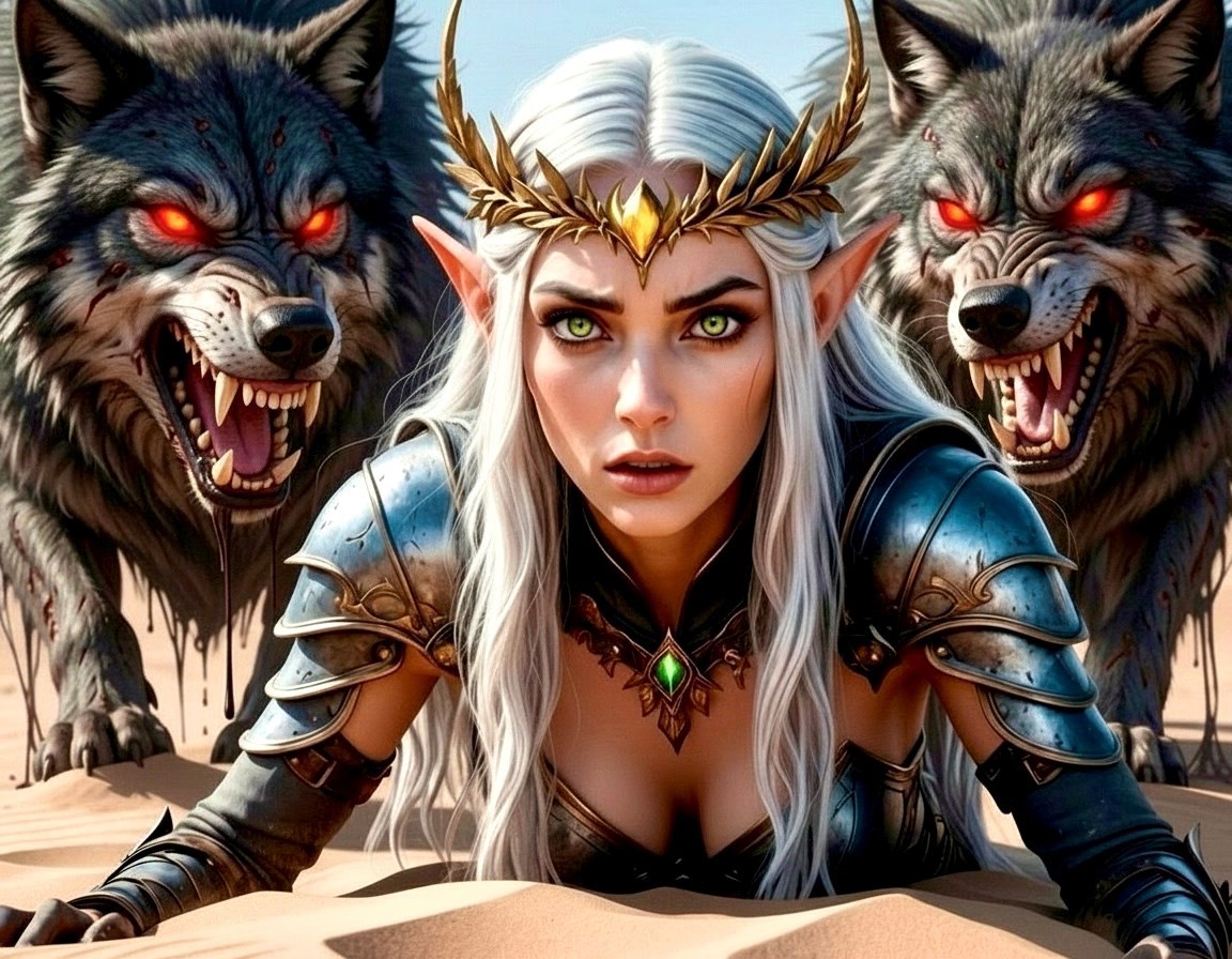 Перед глазами замелькало солнце, барханы и сознание постепенно начало набирать высоту. Едва пик ближайшей дюны остался позади, как львира вздрогнула всем своим телом. На нее смотрели пылающие красные глаза волколака. Снова надрывный вой разрезал уши и появились еще двое. Они шли по кругу, скалясь и облизываясь, а в самом центре ловушки, блестя серебряными доспехами в ярких лучах, стоял эльф, по пояс затянутый в зыбучие пески. Золотой колчан был пуст, а ненужный лук валялся в нескольких антрофах на горячем песке. Эльф из последних сил оборонялся кинжалом, но движения с каждым выпадом становились все скованней, все слабее. Вернувшись в реальность, Каиса схватила Вестагара за запястье.