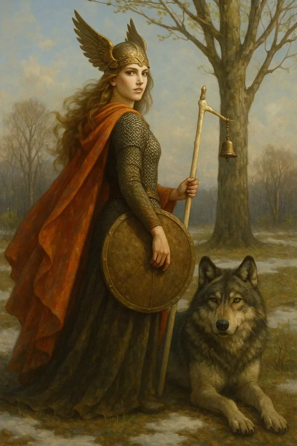 Женщина обернулась, но это оказалась не вёльва. В левой руке она держала деревянный щит, обтянутый кожей, а в правой — длинный костяной жезл, на острие которого висел маленький колокольчик.