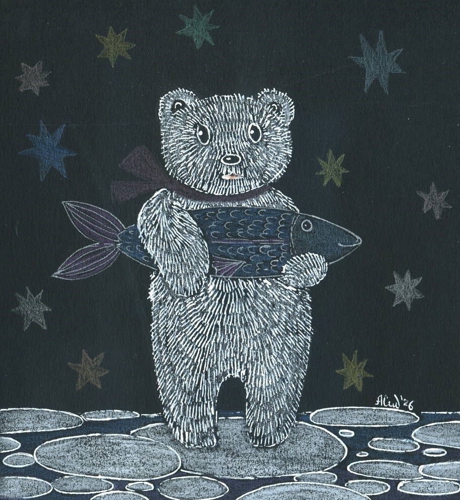 27 февраля — День белого медведя (ну или Международный день полярного медведя, кому как больше нравится). Уже несколько раз рисовала к нему мишек, сегодня — вот такой, стилизованно-мультяшный. Может, не самый удачный, поскольку я решилась на эксперимент с черной бумагой (непривычно!) и карандашами металлик.