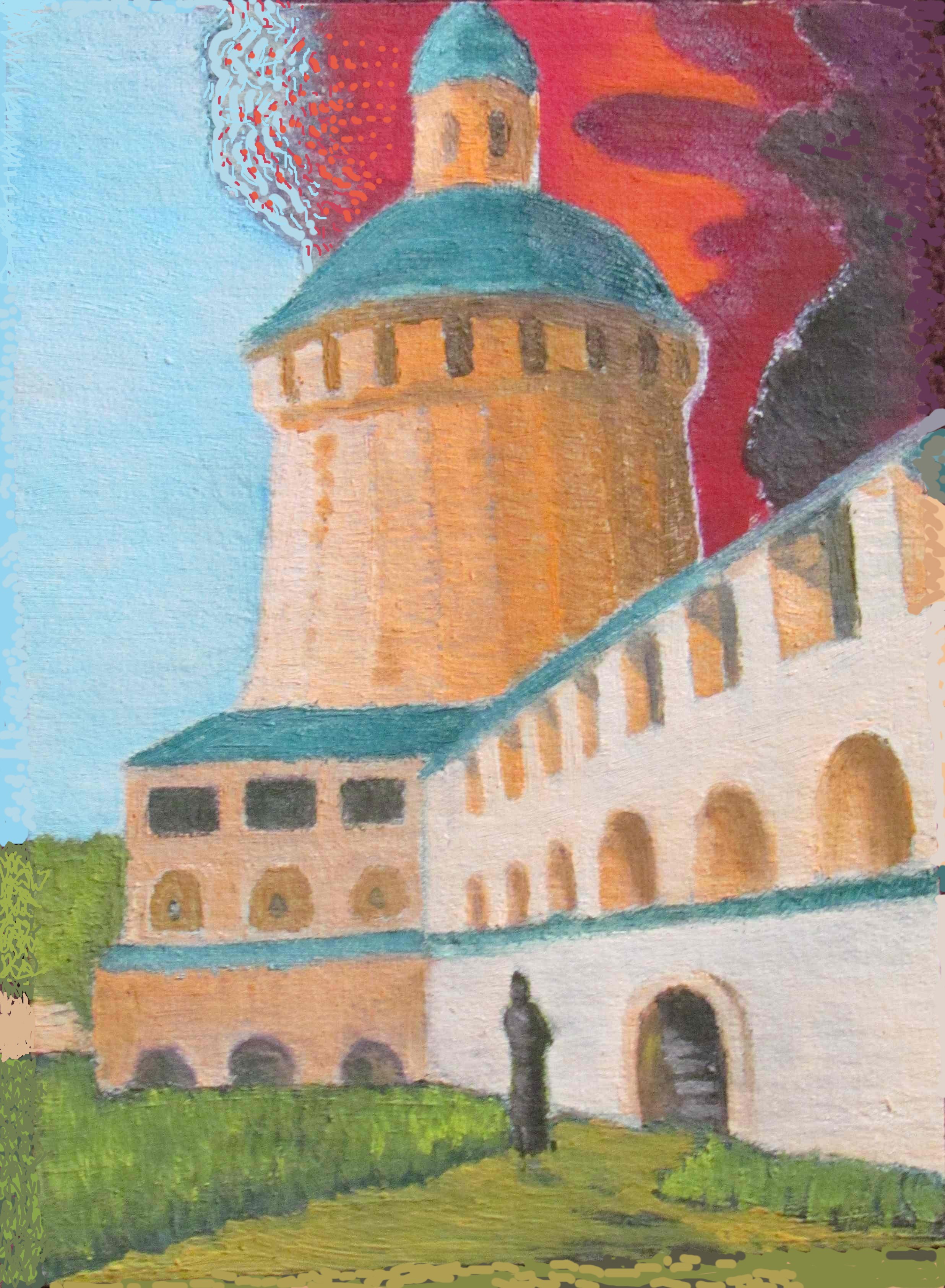 Сам явэтих местах ни разу не был, частично срисовал с открытки, частью довыдумал. Что там за зарево на небе - ну, спонтанно нарисовалось. И фигура во дворе несколько великанская - мне показалось, что надо еётуда поставить.