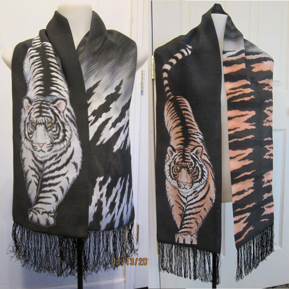 Кто сказал, что доманшим питомцам не свойственно чувство прекрасного? Вот моя котяшка Лу очень даже разбирается в искусстве. Очень она меня просила наваять нечто в духе семейства кошачьих и вдохновила на вот такие тигрячие шарфики :)
