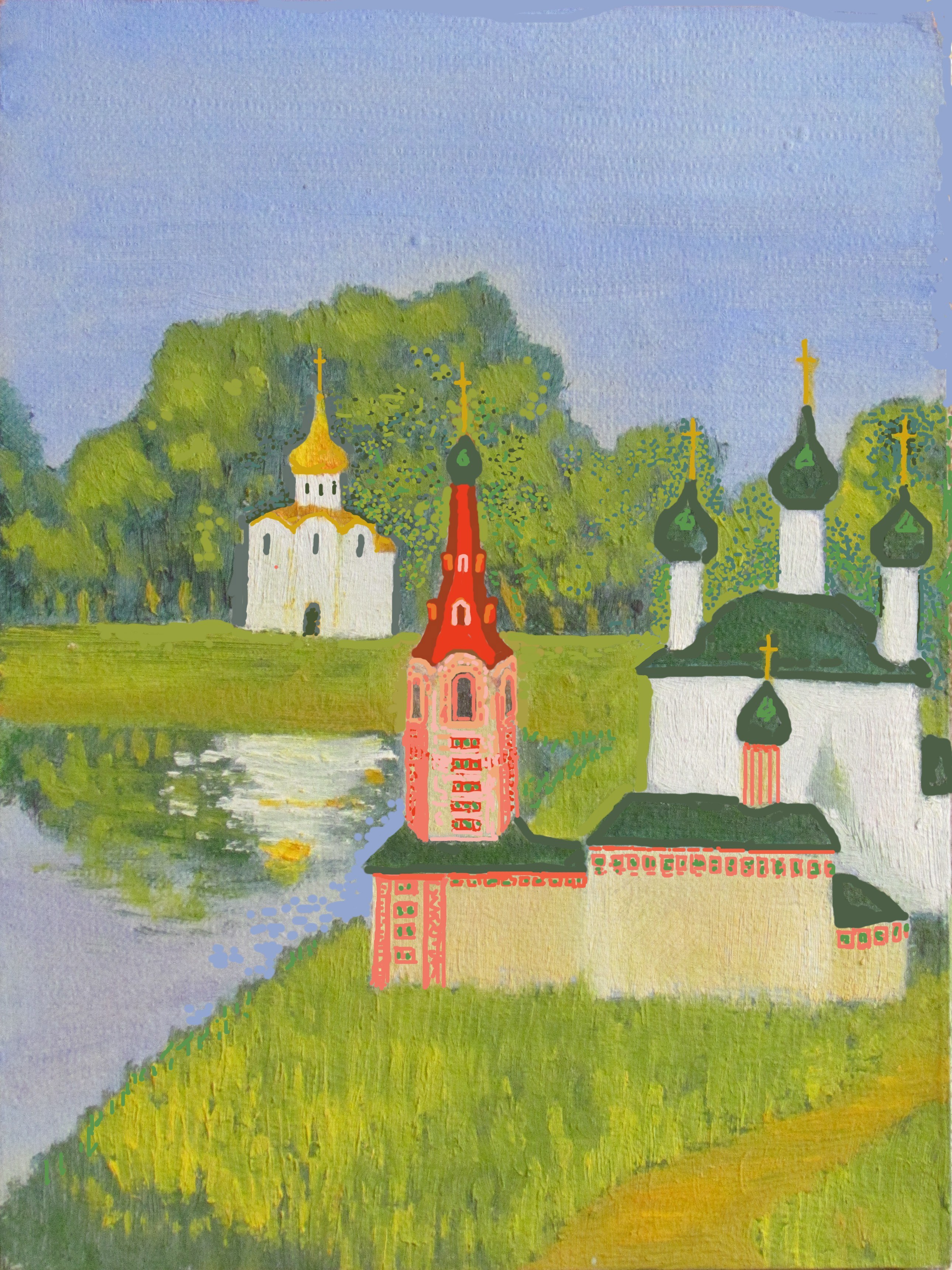 На самом деле это сейчас я её так задекорировал. Выправил колокольню в самом центре рисунка - пришлось и декором остального здания заняться. Чтобы не "как здрасьте". А так - церкви на картине - условно "суздальские". Вдали - памятник белокаменного зодчества века так 12-го, на переднем плане - кирпичные церкви 17-18 вв.