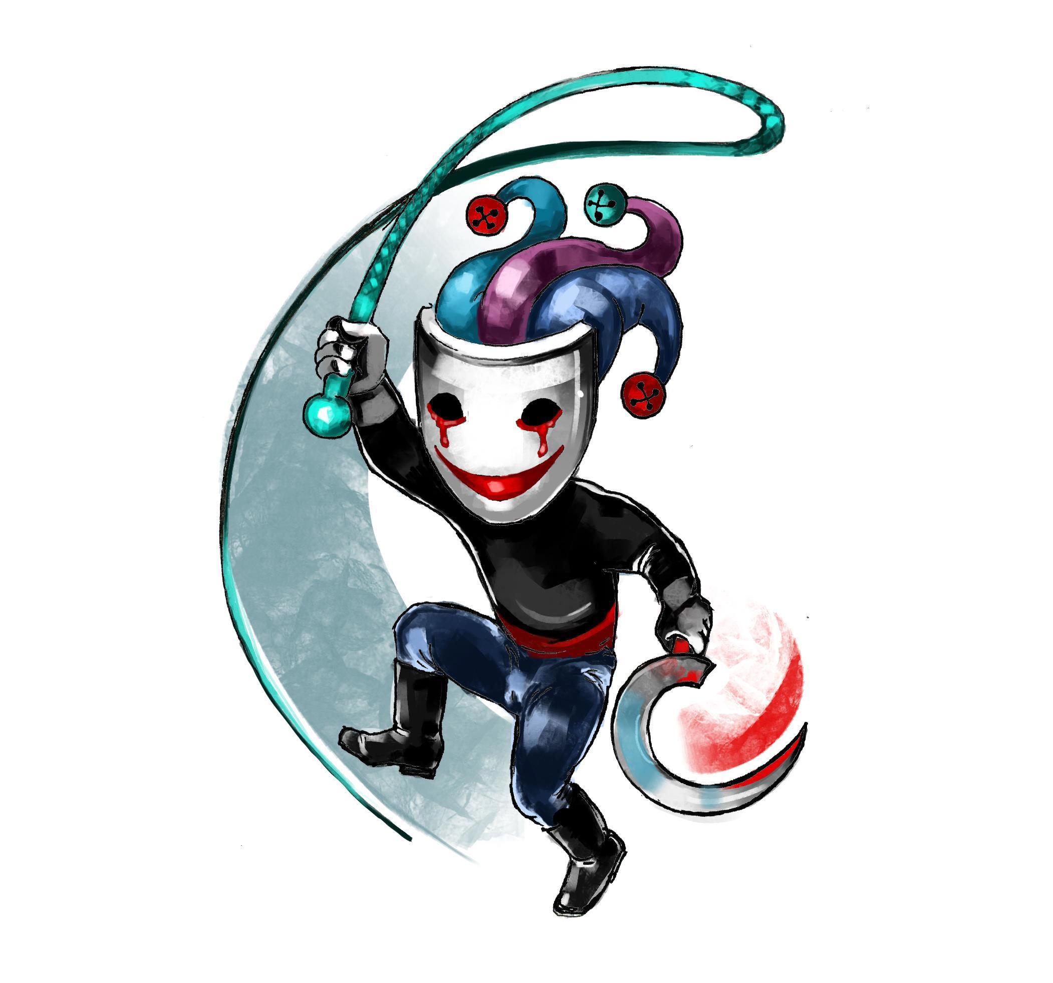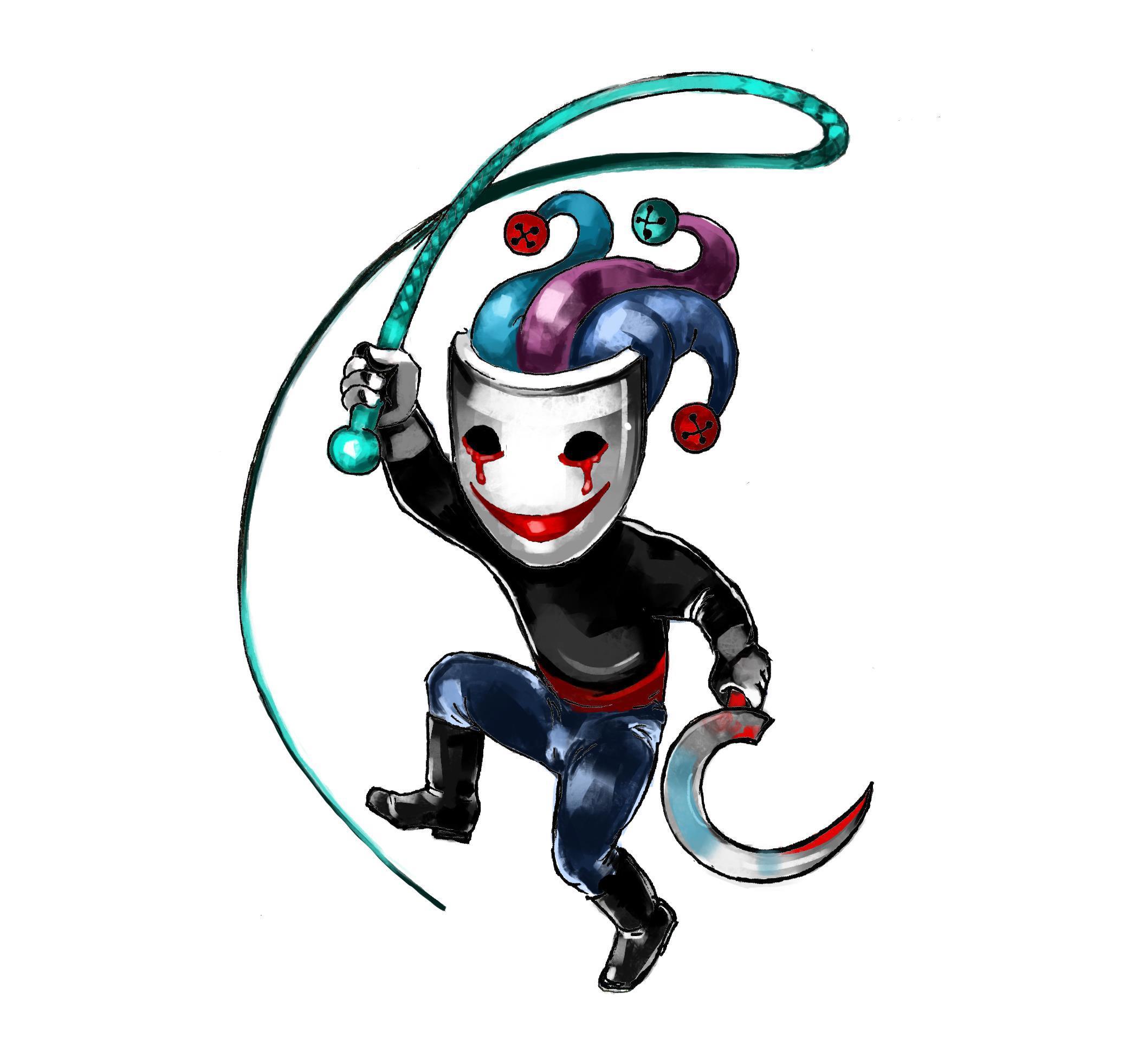 Рот и слёзки красные. глазные дырки чорные, кнут зелёный. Текст по стикеру: