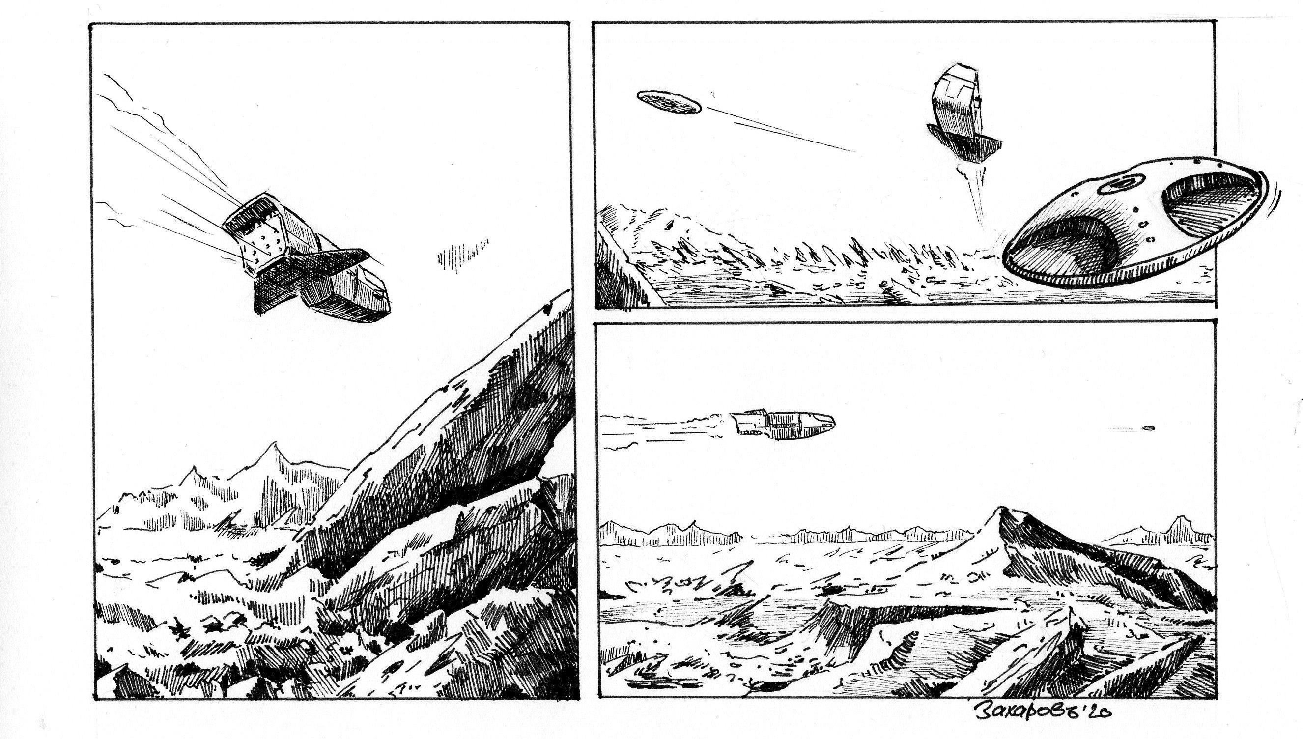 Неизвестная планета - 2 Автор: Сергей Захаров Решили пока не улетать с этой хмурой планеты. Отправили флаер со сканботами для разведки местности... иллюстрация, фантастика, рисунок, комикс 396 Пожаловаться