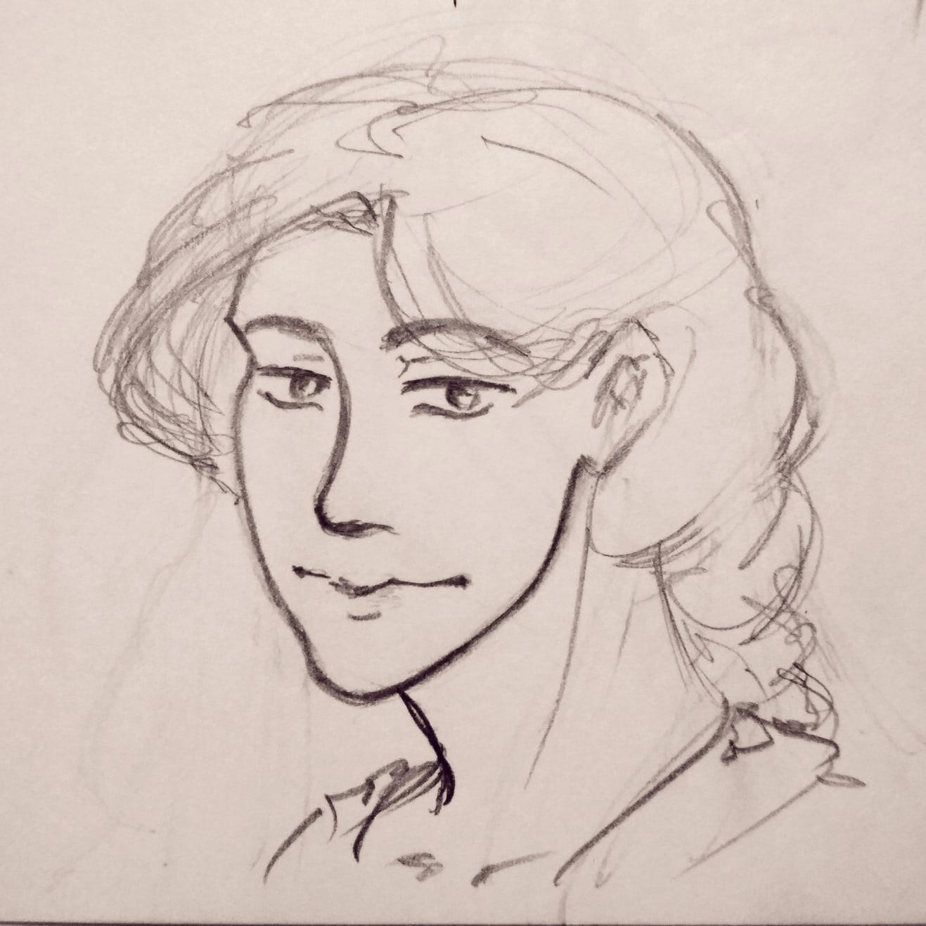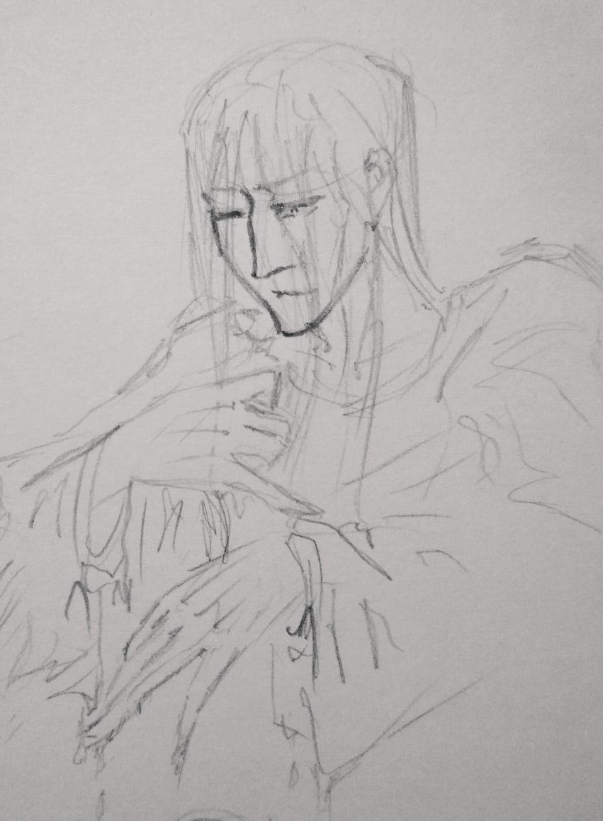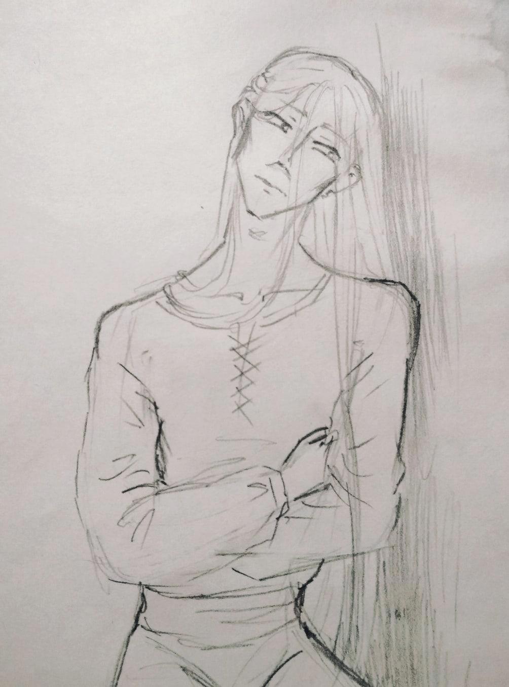 Грустный Эльнес в не соответствующей канону Веревок одежде. По изначальной задумке его лицо должно было быть не слишком красивым, или, скорее... неправильно красивым? Состоящим из специфических черт, но по-своему притягательным. По итогу же я не смогла это изобразить, и мне все говорят, что Эльнес очень красив) Но все же в нем много черт, далеких от общепринятых идеалов. Например, он лопоухий. И его длинные волосы на деле совсем не густые. И еще есть разные детальки.