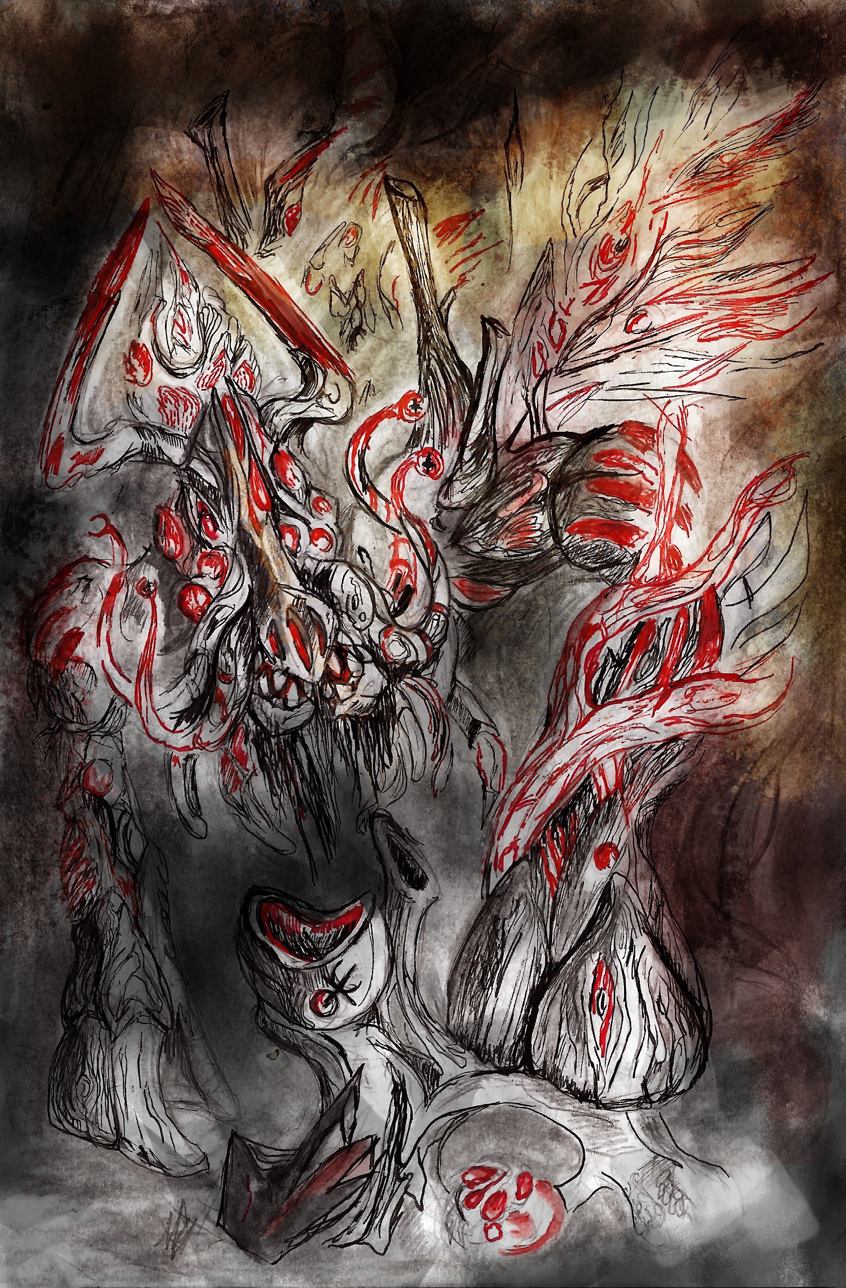 Видите ли, только у этих рогатых гигантов детская форма ведет исключительно вегетативный и прикрепленный образ жизни, питающуюся... Телами тех, кого притащат им бесполые "старшие". А вот старшие в свою очередь исключительно травоядные и находятся в сильной зависимости от колоний своих младших форм, которые общей грибницей поддерживают жизнь в рощах и производят на свет все новые и новые "мячи"-яйца, что старшие доставляют в самые отдаленные уголки дремучего леса. Благо, их широкие когти позволяют им переплывать даже самые мощные стремнины, а деликатные челюсти не раздавят нежную оболочку их груза.